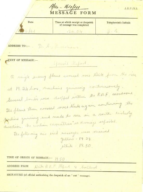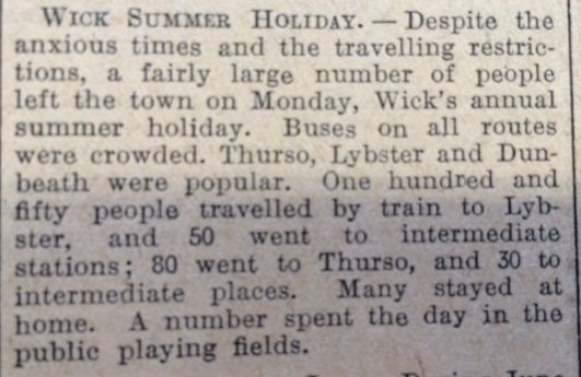 The people of Wick enjoyed mixed fortunes this week. The week started tranquilly enough as the John O’Groat Journal reported that on Monday the town enjoyed its annual summer holiday: “One hundred and fifty people travelled by train to Lybster, and 50 went to intermediate stations; 80 went to Thurso, and 30 to intermediate places. Many stayed at home. A number spent the day in the public playing fields.”Then, on Thursday, “A single enemy plane crossed over Wick from the sea at 19.24 hours, machine gunning continuously. Several bombs were dropped within the R.A.F. aerodrome. The plane then crossed over Wick again continuing the machine gunning and made to sea in a south easterly direction. No civilian casualties or damage reported.”