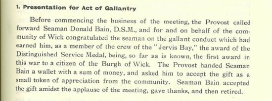 Mackenzie “drew attention to the serious scarcity of water in Castletown, particularly among the tenants of the new houses at the top of the village.” When told that the matter was being dealt with, Mr Mackenzie protested that the system was at risk of collapse: “When you go into the matter you will find that my statement is correct.” This resulted in a crushing reply from the Clerk: “Frankly, you don’t seem to know anything about it”; and the matter was closed. Finally this week, on 6 June Wick Burgh Council honoured Seaman Donald Bain, survivor of HMS Jervis Bay which had been sunk defending a convoy of merchant ships in November 1940. Seaman Bain had been awarded the Distinguished Service Medal, “being, so far as is known, the first award in this war to a citizen of the Burgh of Wick. The Provost handed Seaman Bain a wallet with a sum of money, and asked him to accept the gift as a small token of appreciation from the community.”