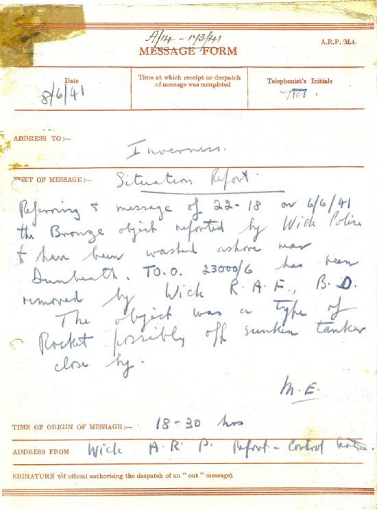 Mysterious objects were still being washed up along the Caithness coast. On 8 June there was “a bronze object reported by Wick Police to have been washed ashore near Dunbeath.” Bomb disposal experts from Wick airfield came and took it away, concluding that “The object was a type of Rocket possibly off a sunken tanker close by.”Over in Orkney, Hetty Munro of Thurso kept up her diary of daily life on the island. This week