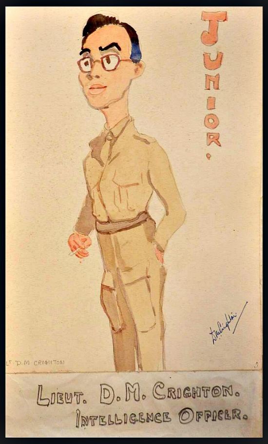Hetty Munro preserved a number of extraordinary caricatures of the officers she worked with during the war. Here is one of Lt. Crichton, intelligence officer, and signed by him.