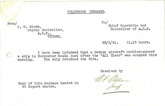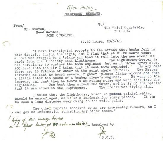 Caithness was still being harassed by German aircraft. On 23 June the Chief Constable at Wick was informed by the Head Warden at John O’Groats: “… at 01.30 hours today a bomb was dropped by a plane and that it fell into the sea about 100 yards from the Duncansby Road Lighthouse.” The Lighthouse-keeper said he heard several fighter planes flying around “and then a little later the sound of a bomber plane’s engines. He went to the doorway, and just then he heard a whistling noise and went back into the lighthouse. The bomb then struck the water.” The warden added that the lighthouse should be camouflaged: “It can be seen a long distance away owing to the white paint.”Later the same day J.S. Storm, Deputy ARP Controller in Thurso, reported: “I have been informed that a German aircraft machine-gunned a ship in Scrabster Roads just after the “All Clear” was sounded this morning. The ship returned the fire.”