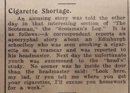 to go to Crossroads School in Dunnet. “The display is very interesting and the members of the party are willing to give an evening show for the benefit of the general public”. We don’t know what the programme was, but the National Archives have put some clips of Ministry of Information films online, with titles such as “Salvage With A Smile” or “More Eggs From Your Hens”. See http://www.nationalarchives.gov.uk/education/focuson/film/activities/world-war-2/1.2-propaganda-clips-pc.htm Finally this week, the John O’Groat Journal reported a joke reflecting the national cigarette shortage. An Edinburgh schoolboy was reported to his headmaster for smoking a cigarette on a tramcar. “Next day the unfortunate youth was summoned to the “head’s” study. No sooner was he inside the door than the headmaster said: “Look here, my lad, if you tell me where you get your cigarettes, I’ll excuse you homework for a week.”