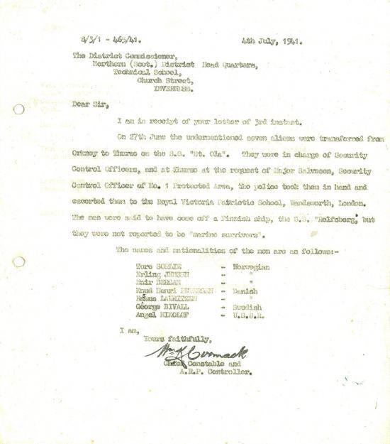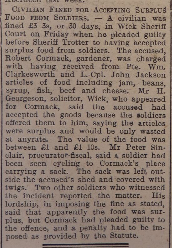 observed as a holiday owing to the Summer Communion Services. 4 July. The school closed for the Summer Vacation. In the afternoon the children and friends were entertained to tea. Mr Moir presided and as it was too wet to hold sports outside, games were enjoyed in the class-room. Mrs Calder, Eastside, presented the prizes and Mr Smith addressed the children. Needlework done by the girls was on display.” Another group of foreign nationals were landed at Thurso this week, from Orkney on board the SS Ola. Interestingly, because the men were Norwegian, Danish, Swedish and Russian (i.e., from nations currently hostile to Britain) they were escorted by “Security Control Officers” and police all the way to London: “The men were said to have come off a Finnish ship, the S.S. Rolfsberg, but they are not reported to be “marine survivors”.” Finally this week, the John O’Groat Journal reported the case of a civilian who was fined £3 3s. for receiving surplus food from soldiers. The man, Robert Cormack, a gardener, was approached by the soldiers and offered “articles of food including jam, beans, syrup, fish, beef and cheese.” In his defence it was pointed out that the articles of food “were surplus, and would only be wasted at any rate”. The Sheriff seemed to be sympathetic but had to apply the law: “His lordship … said that apparently the food was surplus, but Cormack had pleaded guilty to the offence, and a penalty had to be imposed as provided by the Statute.”