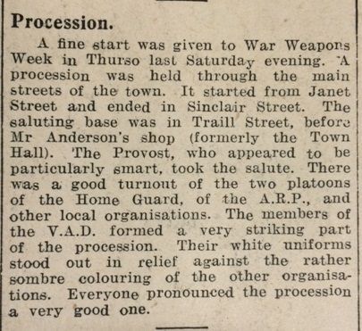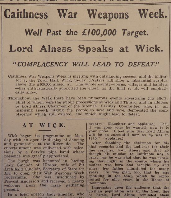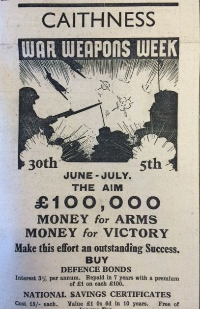 Meanwhile in Caithness the John O’Groat Journal reported that War Weapons Week had exceeded its target of £100,000. Thurso’s events began with a procession through the town, starting from Janet Street and ending in Sinclair Street; “The Provost, who appeared to be particularly smart, took the salute”. Wick began its programme on Monday with “an open-air display of dancing and gymnastics at the Riverside. The entertainment was enlivened with selections by a Service pipe band whose presence was greatly appreciated.”Schools across Caithness were breaking up for the summer holidays. The head teacher of Dunnet Public School recorded in the log book: “3 July. To-day was