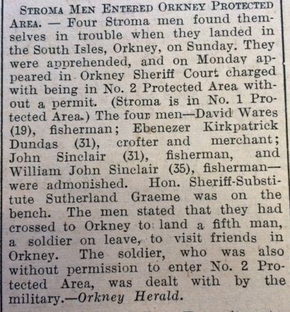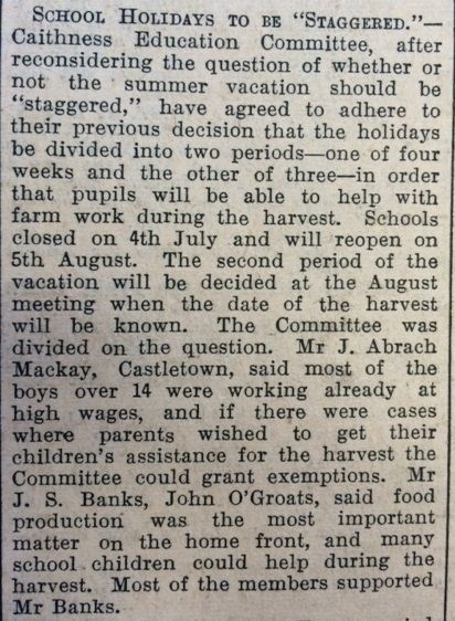 decided this week once again to stagger the summer vacation. As the John O’Groat Journal reported, “the holidays would now be divided into two periods – one of four weeks and the other of three – in order that pupils will be able to help with the harvest.” But because the harvest depended on the weather, “the second period of the vacation will be decided at the August meeting when the date of the harvest will be known.” The John O’Groat Journal also reported the arrest of four men from Stroma this week. The men, three fishermen and a crofter, had crossed over to Orkney with a soldier home on leave, taking him to visit friends. But Orkney was in No.2 Protected Area, whereas Stroma, like the rest of Caithness, came under No.1 Protected Area; and the men didn’t have the correct paperwork. The Stroma men were “admonished” by the Hon. Sheriff-Substitute, but weren’t otherwise punished; but the soldier, the report concludes ominously, “was dealt with by the military”.The Director of Education had been filling in a return to head office about the midday meals the county’s children