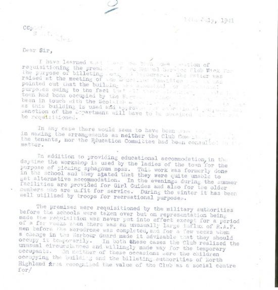 The Navy were proposing to requisition the Mutual Service Club in Wick for the purpose of billeting dockyard labourers, and Ian McHardy, the County Director of Education, wrote to protest because “the building was essential for educational purposes owing to the fact that all