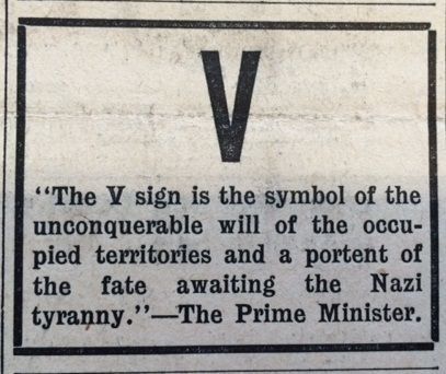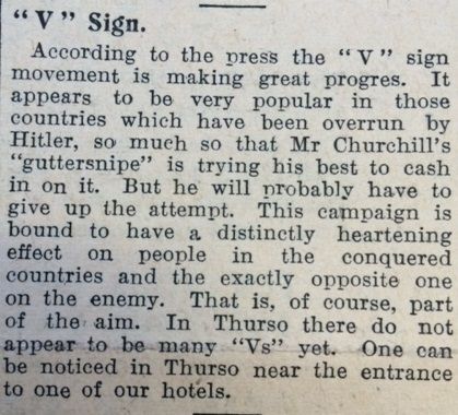 Winston Churchill officially launched the “V for Victory” campaign, by which the V-sign would come to symbolise resistance to Germany. The John O’Groat Journal printed Churchill’s rallying call: “The V sign is the symbol of the unconquerable will of the occupied territories and a portent of the fate awaiting Nazi tyranny.” The letter V was chosen because it was the first letter of “victoire” [victory] in French, and “vrijeid” [freedom] in Dutch, as well as “victory” in English.The John O’Groat Journal also noted, “In Thurso there do not appear to be many “Vs” yet. One can be noticed in Thurso near the entrance to one of our hotels.”