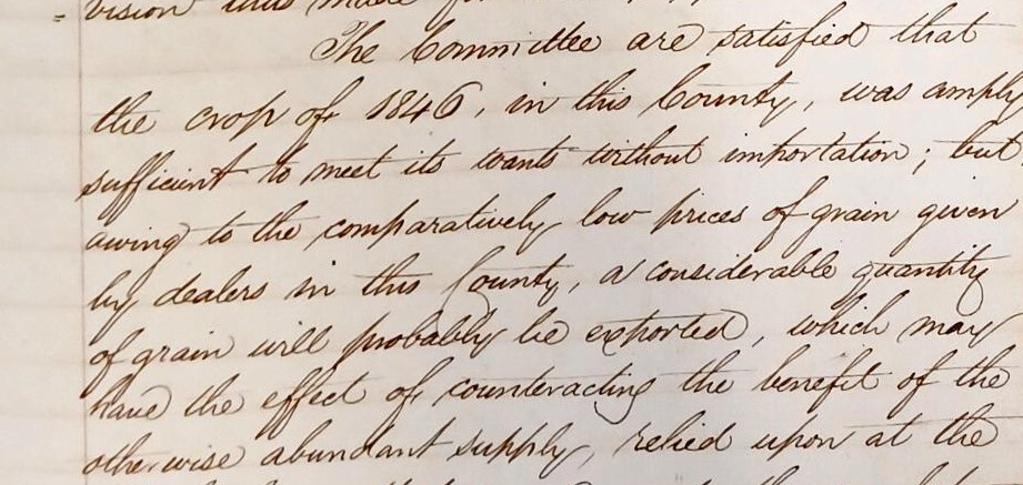 Transcript - ‘The committee are satisfied that the crop, of 1846, in this County, was amply sufficient to meet its wants without importation; but, owing to the comparatively low prices of grain given by dealers in this County, a considerable quantity of grain will probably be exported, which may have the effect of counteracting the benefit of the otherwise abundant supply’.