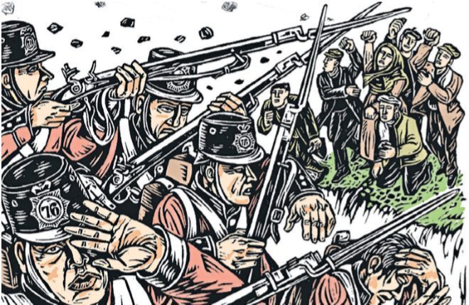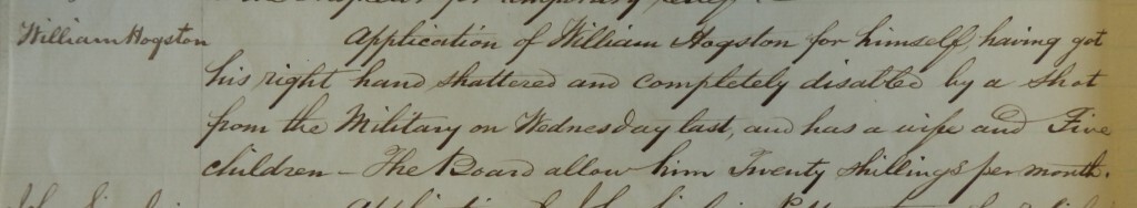 ‘Application for William Hogston for himself having got his right hand shattered and completely disabled by a shot from the Military on Wednesday last, and has a wife and five children. The Board allow him Twenty Shillings per month’