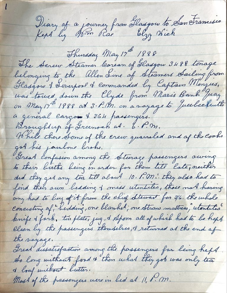 ‘And now in concluding my diary of a trip from Glasgow to San Francisco I would ask the reader to excuse my mistakes and lay them down to my misfortune and not my fault. I am yours very truly, Wm Rae, 1516 Alcatraz Ave., Berkeley, California, USA’
