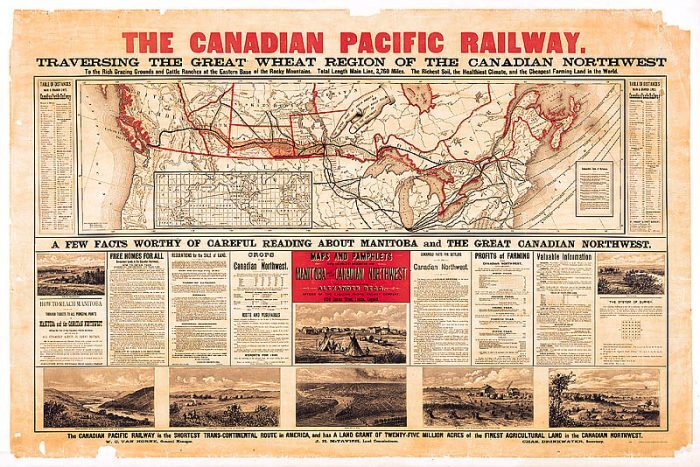 The ship docked in Quebec that night and the following day Rae boarded a Canadian Pacific Railway train headed west. He described the carriages or ‘Colonists Sleeping Cars’ as they were called, as having seats that turned into beds sleeping two. Each carriage had twenty-eight beds with a toilet at one end and a stove at the other. The passengers had to provide their own bedding but as the weather was warm most slept with a topcoat or similar as a cover. Rae had bought provisions to cook on the train to save money.