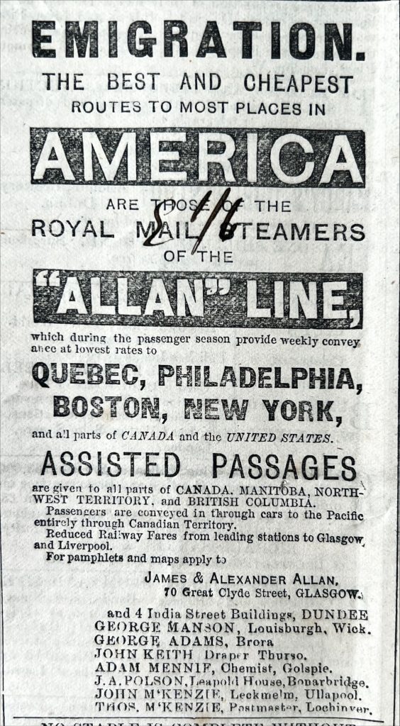 The John o’ Groat Journal carried a weekly advert for Allan Line steamers promising the ‘best and cheapest routes to most places in America’.[4] The passenger line had an agent in Wick, so even those far from the embarkation port could arrange passage with ease.