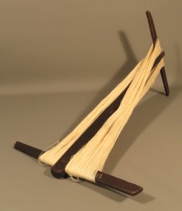 Wool winders are made from a base – sometimes this was made from an upturned tree trunk and branches, as above – and two cross arms that rotated atop this stand. Originally the winder would have had an upright peg protruding from each arm (these are now missing). The skein would be looped around these, and then the yarn could be unwound onto a bobbin etc. Winders are known as sgianan in Gaelic, although I.F. Grant had recorded these as skianans in her original catalogue, either intentionally or mistakenly replacing the “g” with a “k”.