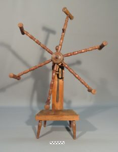 So, mar sin leibh (goodbye) to baskets and latha math (hello) to textile craft hand tools. This part of the collection is concerned with the homemade production of textiles, from processing the raw textile fibre, through spinning it into yarn and then winding it into skeins (loose coiled lengths of yarn) or onto bobbins it so it is ready to weave or knit with. We have spinning wheels and looms in the collection, but for this project we’re focusing on the smaller tools and implements. Like with baskets, this is another whole world of objects that I previously had little specific knowledge of. Let me share with you what I’ve learnt so far.
