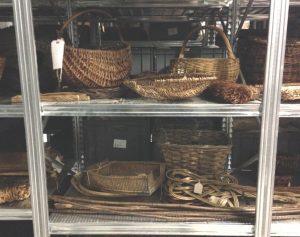 With a heavy heart, we now bid farewell to baskets. All the records are updated, the baskets that needed it have been treated for pest infestation, and the collection, once jumbled up on crowded shelves, has been rehoused. We’ve organised them into basket type and function, and the shelves have been rearranged to make the best possible use of space. Each basket is resting on inert foam to offer support and cushioning for long term storage. The most fragile baskets are sitting in their own box or tray, for extra care.