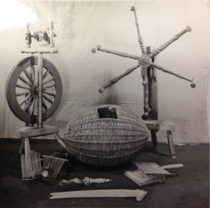 So there you have it, a whistle stop tour of the textile craft hand tools. Here’s an image from I.F. Grant’s photo album (c.1940s) of some of the textile objects posing together, including our old friend, a basket! Raw fleece was kept in wool baskets or mudags such as these, and tufts were pulled out for spinning. It’s said that the baskets were kept next to a fire, as this would warm the wool up and soften the lanolin, which made it easier to spin.