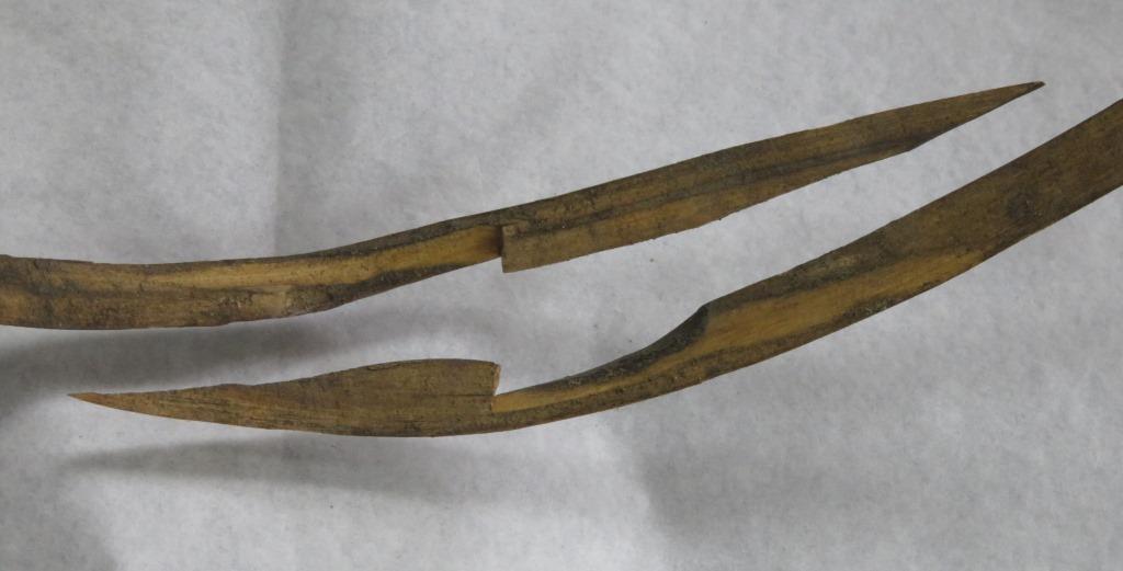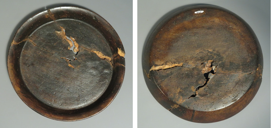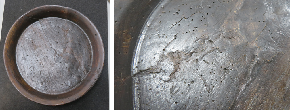 One of the most common methods of repair in the past has been staples, where a small bridge or loop of metal is inserted in to the surface of an object on either side of a break, ensuring that two pieces hold together. But sometimes this isn’t enough, and we have examples of where a metal hoop has been fixed around the exterior rim of a bowl, or where metal plates have been secured to the rim to prevent a crack from getting worse, or even use of a snaking metal thread running down the exterior surface of a crack to hold two sides together. But my very favourite repair has to be a butterfly join, where a new bow-tie shaped piece of wood is spliced in to the exterior surface of a plate, bridging the crack.