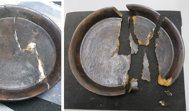 To repair this plate my first job was to take it apart. When choosing an adhesive today I would always opt for something that I know will be easily reversible in the future, even 100 years from now, but unfortunately the adhesive used on this plate wasn’t so easy to remove! First I placed the plate in a sealed polythene bag, along with a beaker of acetone, which slowly evaporates and softens the adhesive enough to gently remove it from the break edges using a scalpel. This revealed that large areas of the plate were missing and had been filled in using plaster, which again was removed with a scalpel. In some areas a thin surface layer of the plate remained attached to large chunks of old adhesive, and in these cases the old repair material was left alone for fear of damaging the original wooden patina.