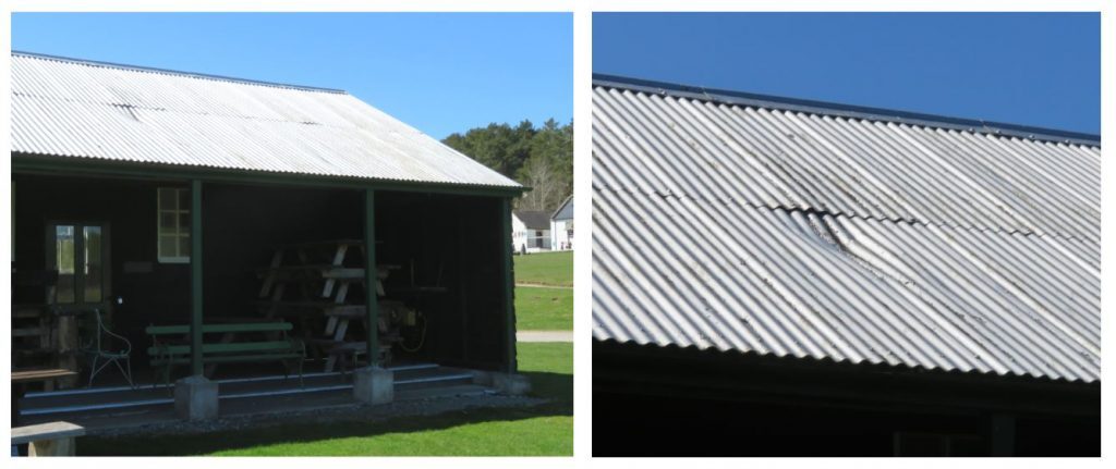 The shinty pavilion at the Highland Folk Museum, which came from The British Aluminium Co. Ltd. Works in Boleskine, Foyers, has still-visible damage from WWII. On 13th February 1941, a German air raid on the works, left large shrapnel dents in the corrugated roof of the pavilion. These have been left in place as part of the building’s history, rather than being repaired when the pavilion was moved to the Museum in 2013.
