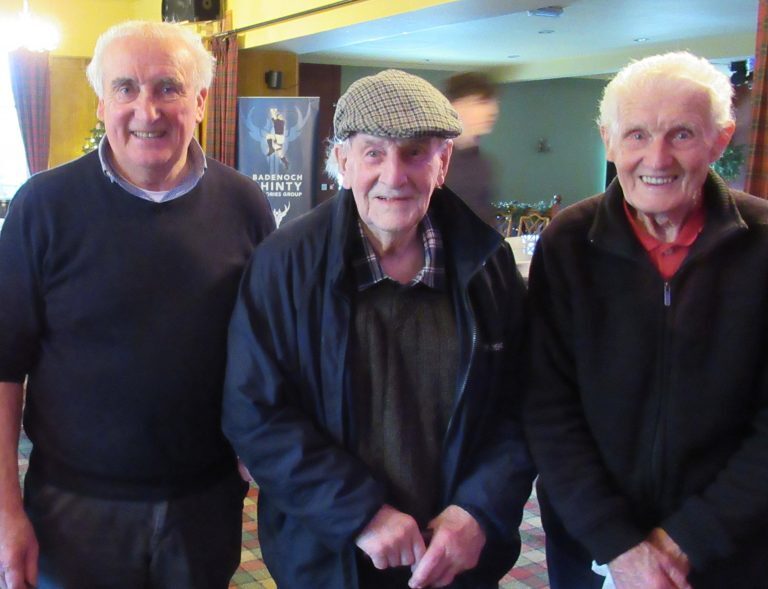 Tommy Wade, centre, with John Mackenzie (left) and Dondo Kennedy (right), at a Badenoch Shinty Memories event in December 2019. Photo credit: Badenoch Shinty Memories