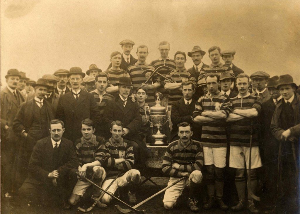 Johnnie Cattanach in 1907-08 Newtonmore team photo with the Camanachd Cup. Photo courtesy of Hugh Dan MacLennan