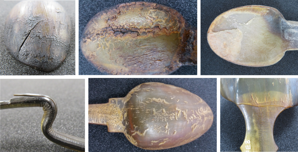 When condition checking an item, such as a horn spoon or tumbler, it helps for me to know a little about the material that it is made from, as well as the manufacturing processes it has gone through, because this will often affect how an object will age and deteriorate. Within horn, due to the process of heating and moulding, it is common to see very small stress lines within spoons, often around the edges of the bowl or down the handle, which indicate areas of internal pressure, which are sometimes a precursor to more serious deterioration. Given that horn forms in layers around a bony core, it is also common to find that horn objects are beginning to delaminate, which can be seen when thin layers within the object begin to lift and separate from one another. Another very common (and often disgusting!) form of deterioration within horn is scaling, when the surface breaks out in to little scales, often which are lifting slightly from the surface and which have darkened with caught-up dust and dirt.