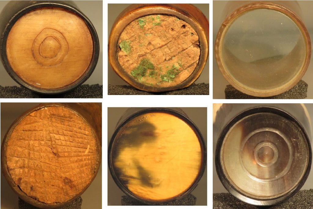 When cooled, the beaker could then be removed from the former and turned on a lathe to smooth any rough surfaces, however, we also have several in the collection where the rough surface and bent shape of the horn has been retained. To make a water-tight base for the tumblers a groove would have been formed on the inside of the narrow end of the tumbler, and this end heated until it was malleable. A circular disk of glass or horn would then have been slipped in, and the horn would cool and contract, holding the base in place. Within the collection we have several tumblers with very intricate, turned bases, as well as a few where the base has broken and been repaired using either cork or wood.