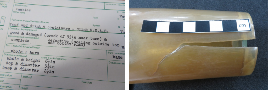 We are very lucky that during the 1980s an audit similar to the work that Helen and I are doing was undertaken on the hornware collection, and during this time any issues with condition were noted. While writing my own condition check I will read over these records, and these will allow me to make a comparison about how an object has changed over the years. For example, thanks to our records I know that SJ.0060, a horn beaker with a glass base, had a crack of 3 ¼ inches in 1980.