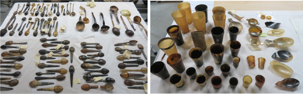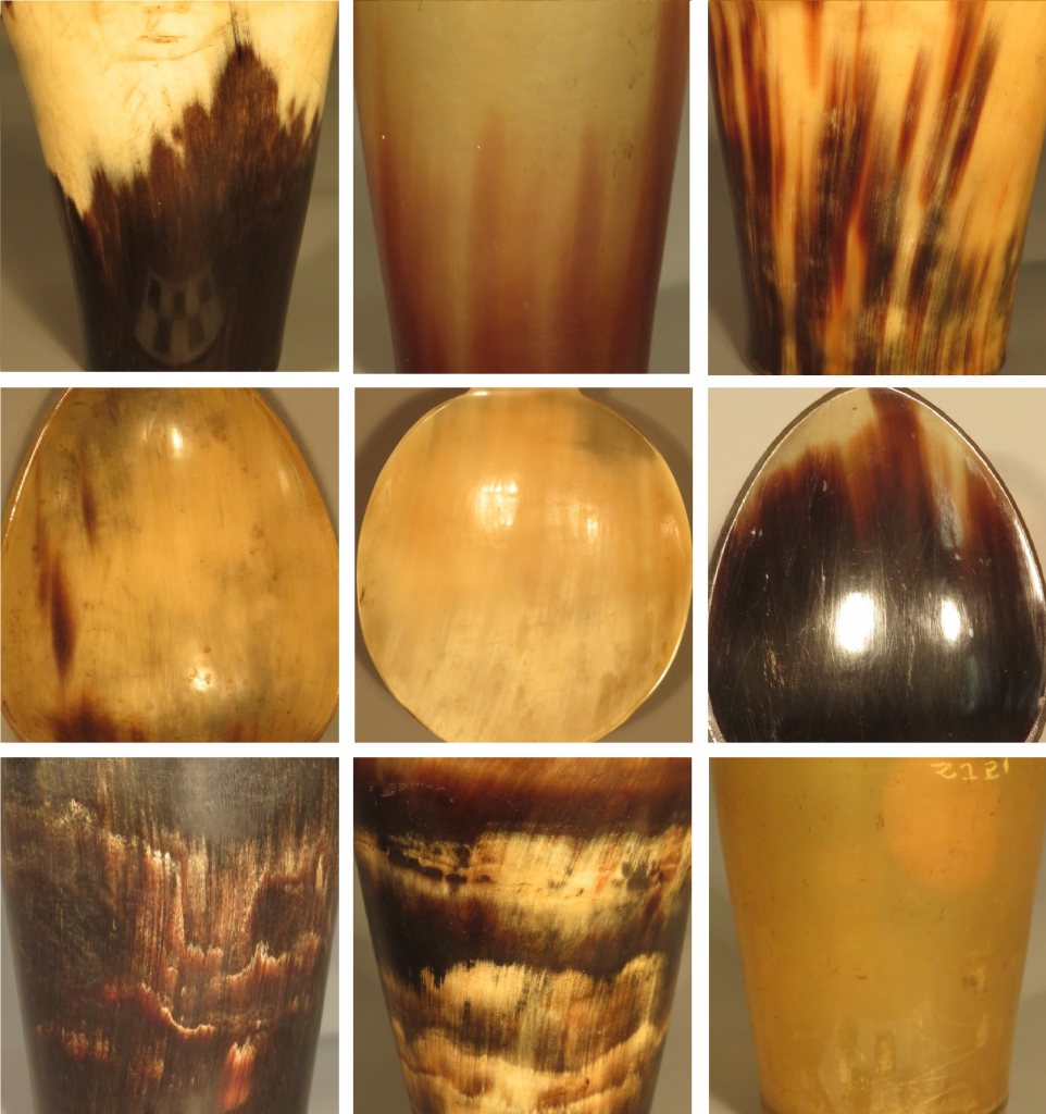 Another item that was commonly used and created using horn are tumblers, sometimes known as beakers, and within the collection we have 35 of these vessels. These would have been used as everyday drinking vessels and are thought to have been a natural development from the drinking horn which was difficult to set down or store. Unlike the spoons, where the horn first had to be flattened before the spoon shape was moulded, tumblers would have been made by forcing an un-slit, heated section of horn on to a metal or wooden former.