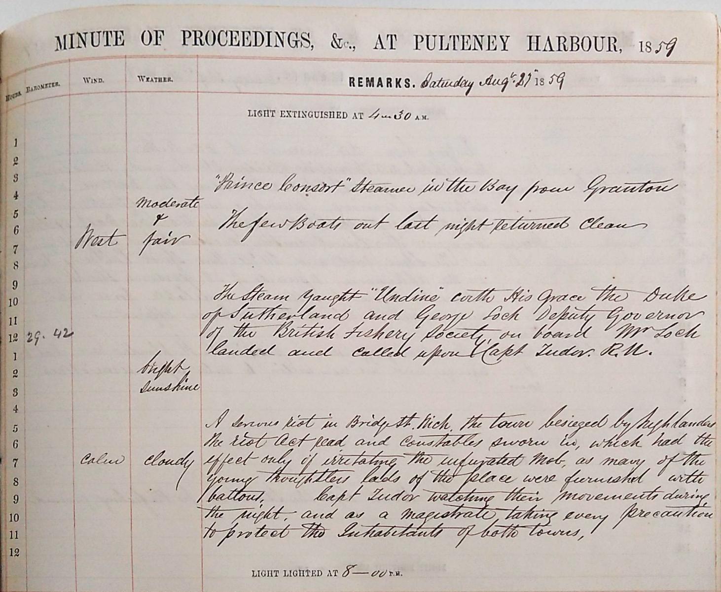 The riots themselves began on the 27th of August with the log book recording ‘a serious riot in Bridge St. Wick, the town besieged with highlanders, the Riot Act read and constables sworn in, which had the effect only of irritating the infuriated mob, as many of the young thoughtless lads of the place were furnished with battons [sic], Capt. Tudor watching their movements during the night, and as a magistrate taking every precaution to protect the inhabitants of both towns’. Captain Tudor’s prominence within the community and direct involvement is confirmed here, as is the political nature of the log book itself and the inherent bias its entries are functioning within. We are given no indication of why the rioting began, only that it is the highlanders who are the perpetrators. The following day the violence ebbs for the first time with ‘quietness reigning, the greatest decorum observed’.