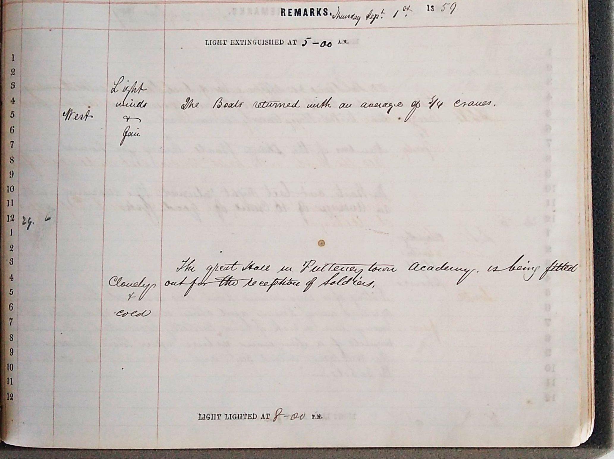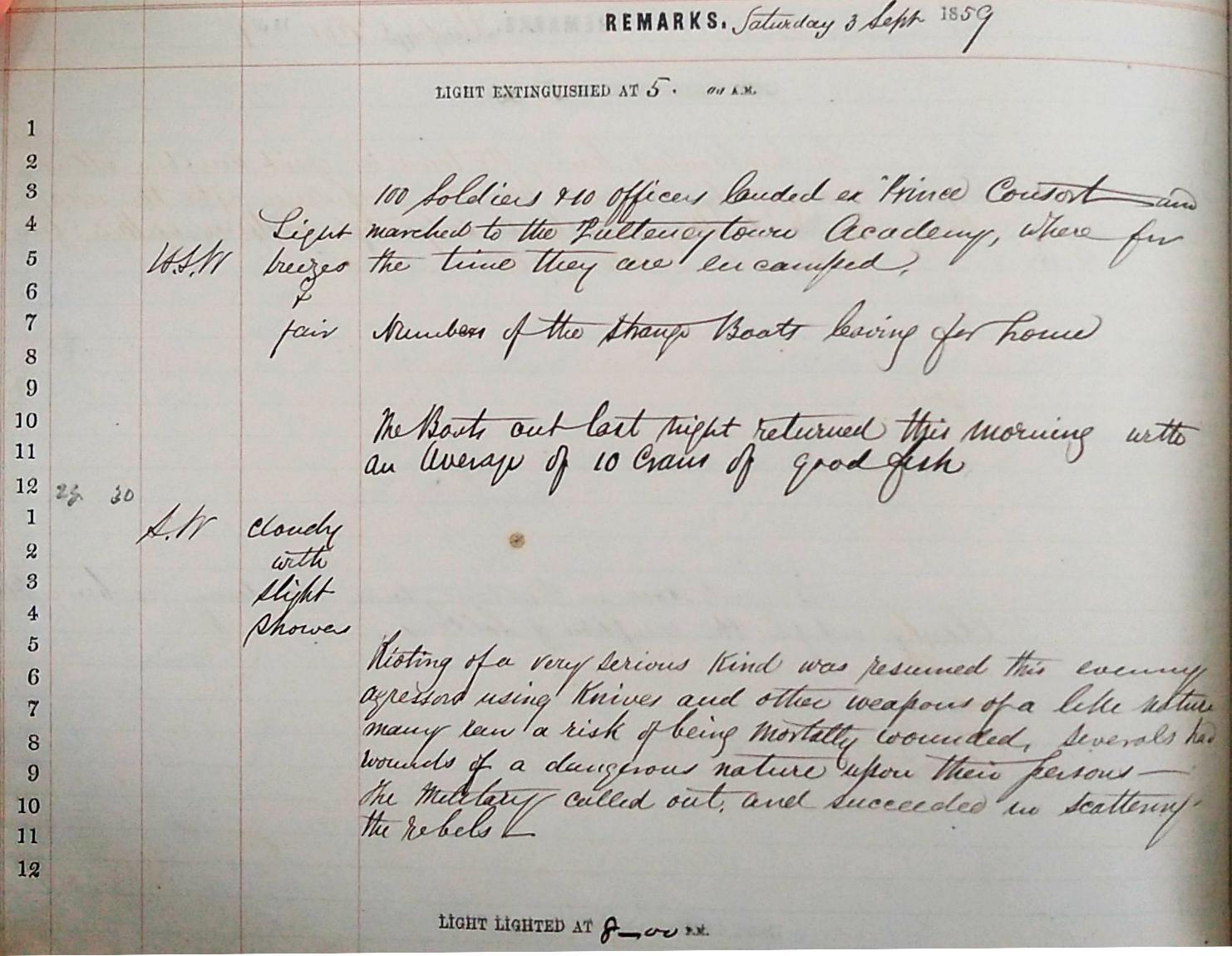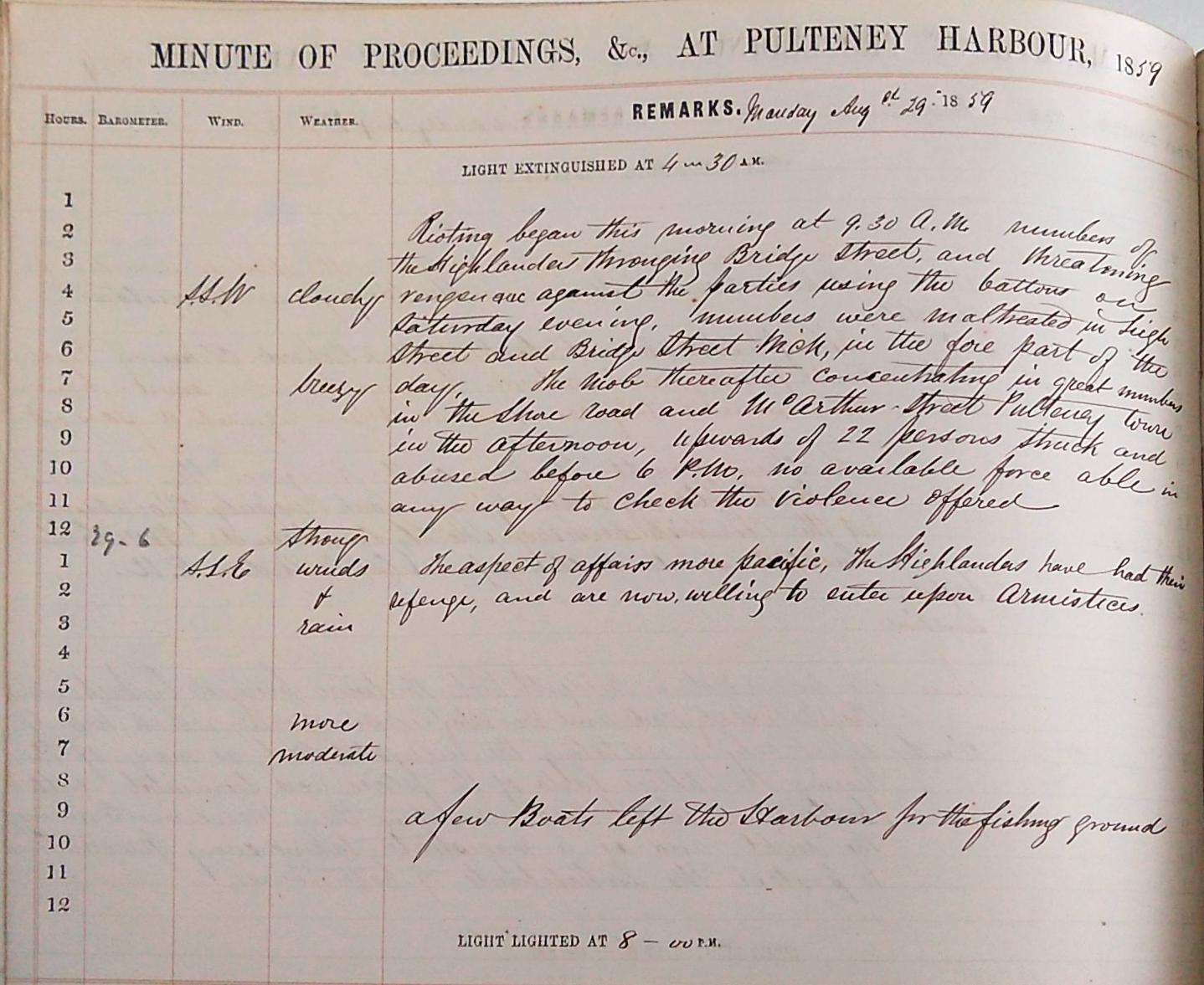 Throughout the rioting boats continue to leave for the fishing grounds and their average crans are recorded. The juxtaposition of entries such as, ‘the boats returned with an average of 5/4 crans’ and ‘the great hall at Pulteneytown Academy is being fitted out for the reception of soldiers’, on September 1st is quietly unsettling. On the 2nd we are told that the ‘Lewis boats [are] leaving for home’. ‘Numbers of the strange boats’ continue to leave for home on the 3rd whilst ‘100 soldiers & 10 officers landed on “Prince Consort” and marched to the Pulteneytown Academy’. These boats appear to be leaving early to avoid further confrontation as some people had been attacked in Pulteneytown ‘just because they were speaking Gaelic’[14]. They escaped just before, ‘rioting of a very serious kind was resumed this evening, aggressors using knives and other weapons of a like nature, many ran a risk of being mortally wounded, several had wounds of a dangerous nature upon their persons. The military called out and succeeded in scattering the rebels’.