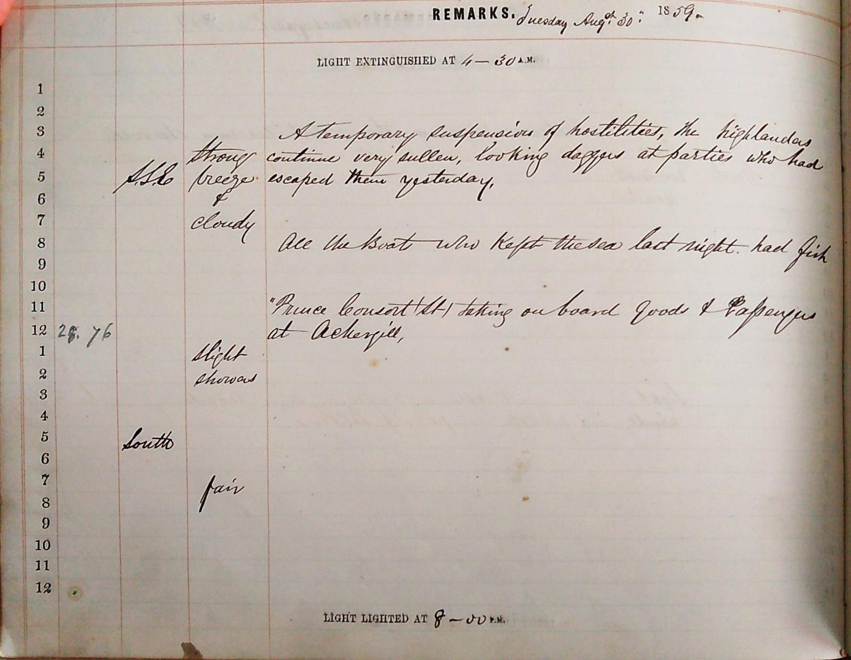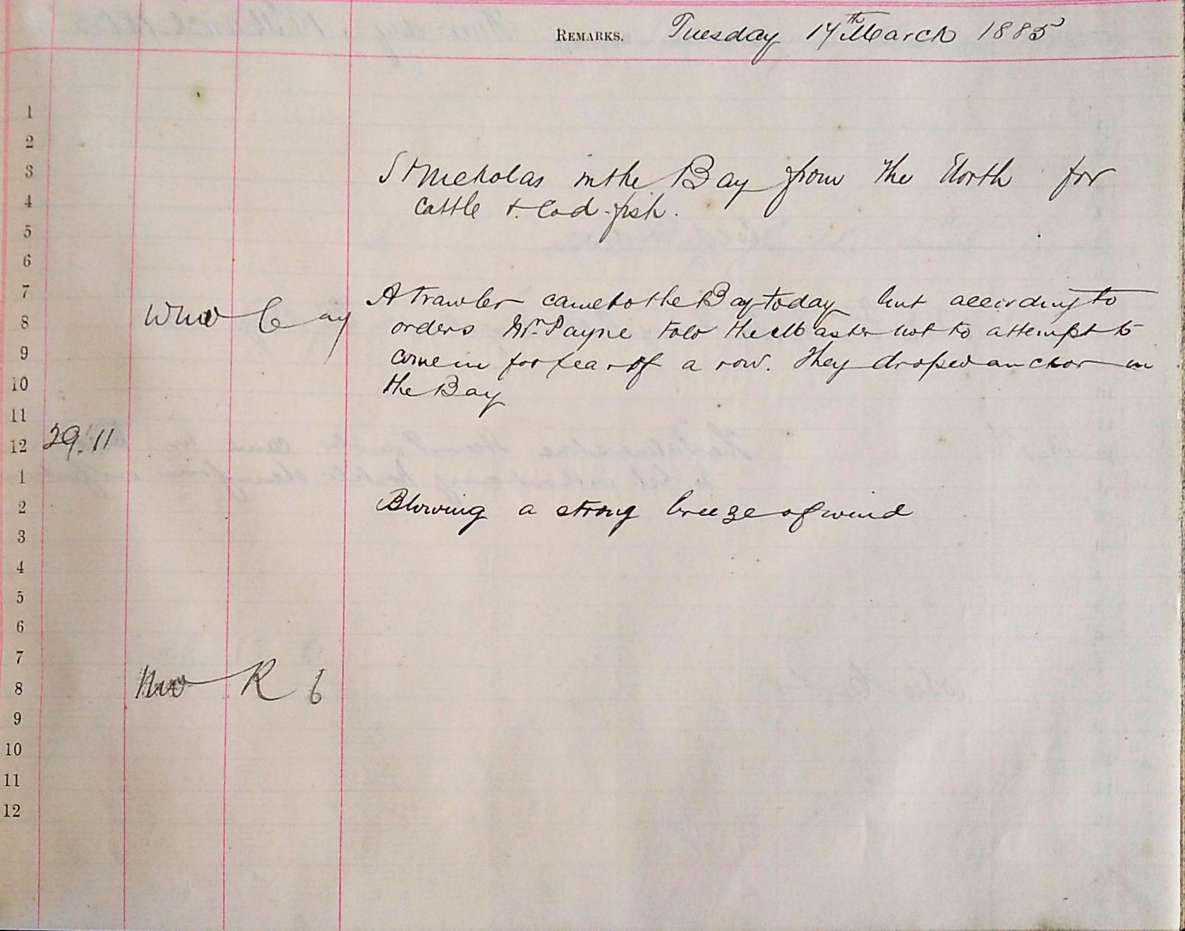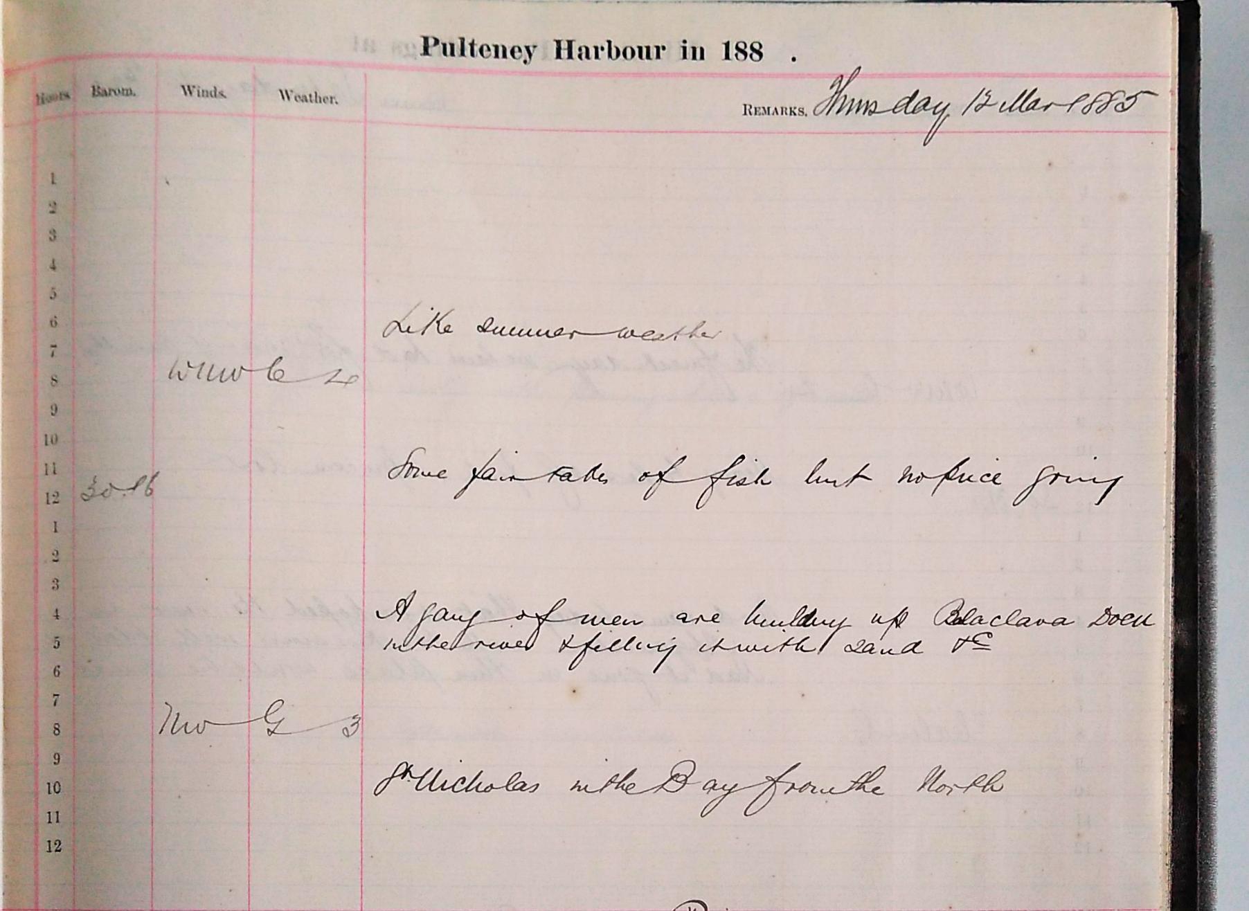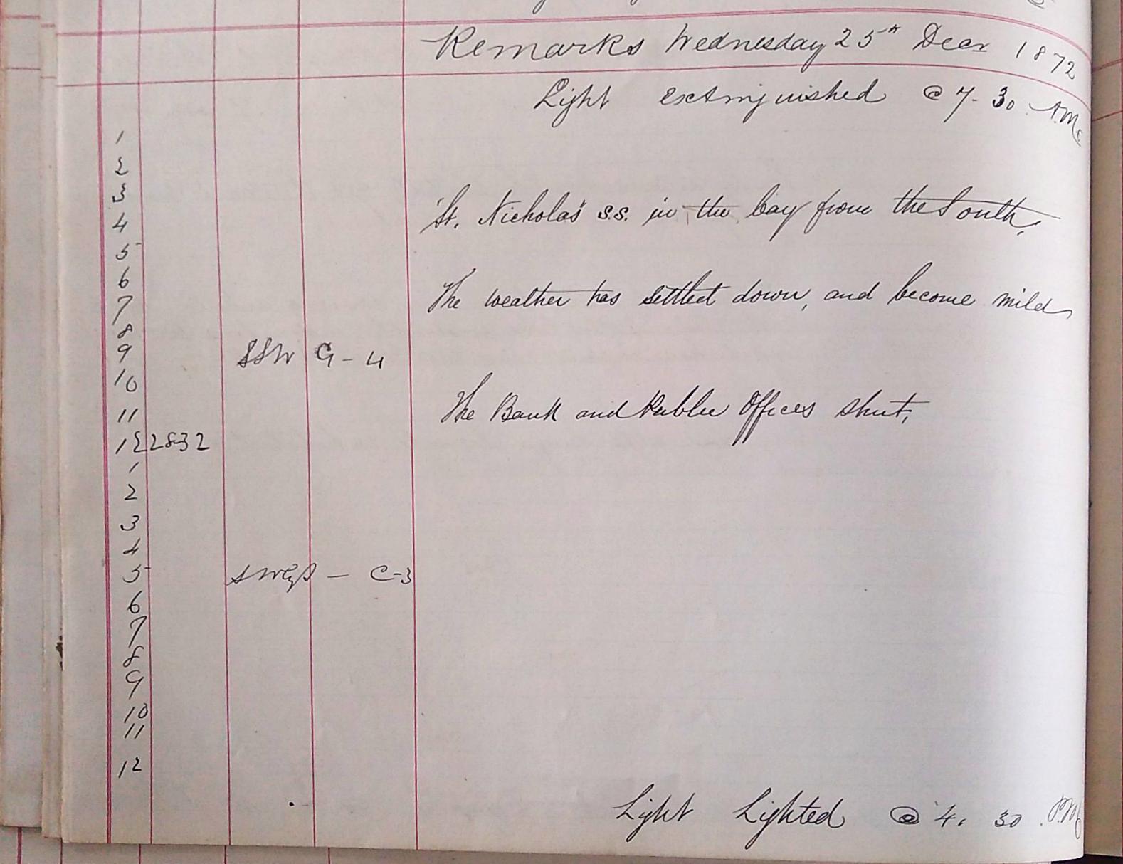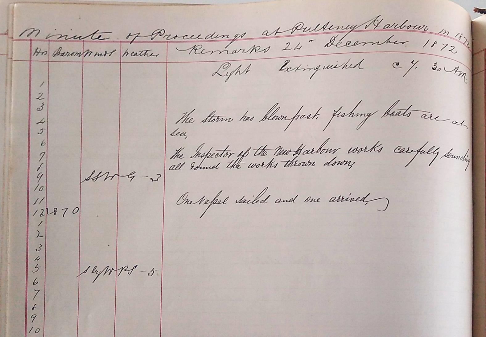 On the morning of the 24th the log book announces that ‘the storm has blown past, fishing boats are at sea’. The Inspector of the new harbour works is ‘carefully sounding all round the works thrown down’ and ‘one vessel sailed and one arrived’. Finally, on the 25th we are told that the ‘weather has settled down and become mild’, perhaps a much-appreciated Christmas gift.