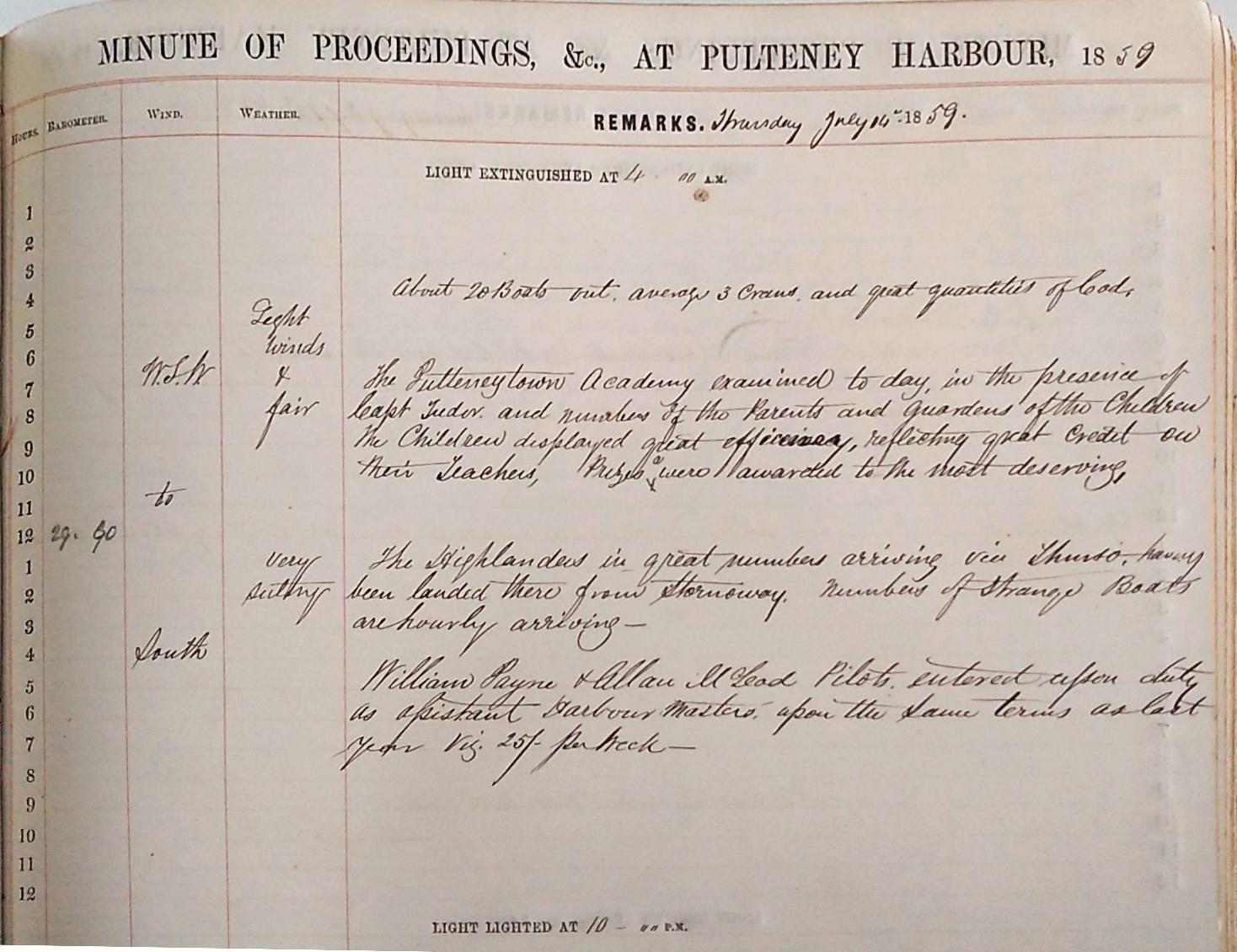 The herring season would often start around July and the first image below (click to enlarge) is from the entry for the 14th of July 1859. In it we are told there were roughly ’20 boats out, average 3 crans and great quantities of Cod’. A cran was a unit of measurement for landed, uncleaned herring and equated to around 37.5 imperial gallons or typically 1,200 fish (but could vary from 700 to 2,500)[13]. The author then tells us that the Pulteneytown Academy was examined today ‘in the presence of Capt. Tudor’. As discussed above it is most likely that Captain Tudor was harbour master at this time. Was someone else writing the log under his supervision? Did he enjoy referring to himself in the third person? Was he in fact not the harbour master? It is impossible to tell from the evidence we have and often these little mysteries must go unanswered. It does seem most likely that he was the harbour master but that he may not have been the direct author of the log book. More importantly, we are told on the 14th that ‘the highlanders in great numbers [are] arriving in Thurso, having been landed there from Stornoway. Numbers of strange boats are hourly arriving’. It seems the yearly immigration had begun, and it is clear the writer does not consider himself to be a highlander. The use of this terminology exemplifies a clear divide, an otherness. Having arrived in Thurso most of the highlanders would then walk to Wick. The success offered by the herring season at Wick seems distinct when we consider the enormity of their journey and the months spent away from home every year.