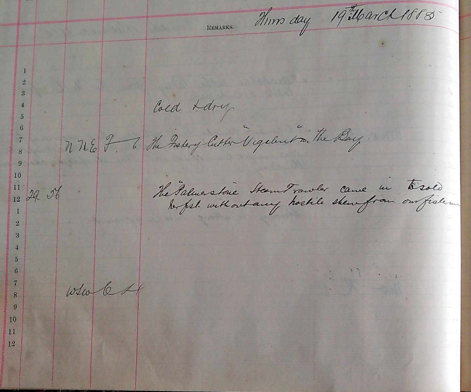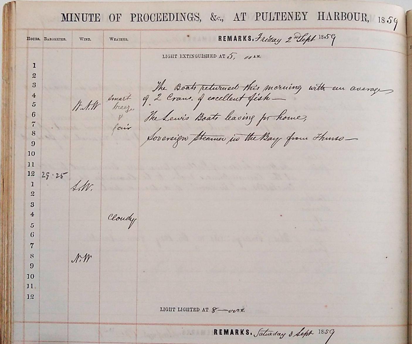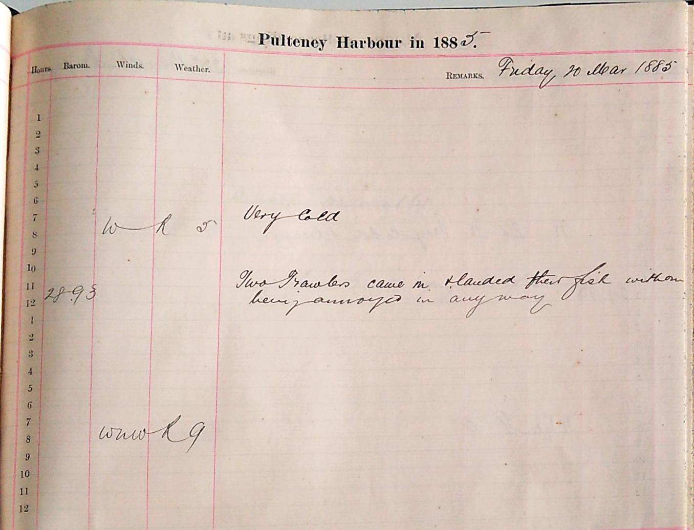 A log is an official record of events. Official records should be unbiased and factual. However, all official records are written by individuals; biased, fictitious beasts that they are. Regardless, we may expect a far higher decorum within an official log book than to say a personal diary. There is a perceived public audience with an official record; an agenda at work, whether that of the British Fisheries Society or the Wick Harbour Trust members; standards and regulations to be adhered by. As mentioned above the harbour master was a regulatory presence within the harbour and an influential & political presence within the town. The replacement of Captain Eden with Captain Tudor attests to the expected propriety of such a figure and in many ways we can expect the content of the records to reflect this. The defence of certain vested economic interests is also evident. It is certainly true however, that the great pleasure in reading the harbour master’s log books is that they are often more emotive and descriptive, personable and bold, than might be expected in first discovering them. Within these more honest, perhaps intuitive entries, that capture ongoing periods of unrest or crisis, we hear stories from the archive through the office of an important local figure, often documenting between a formality and a reality.