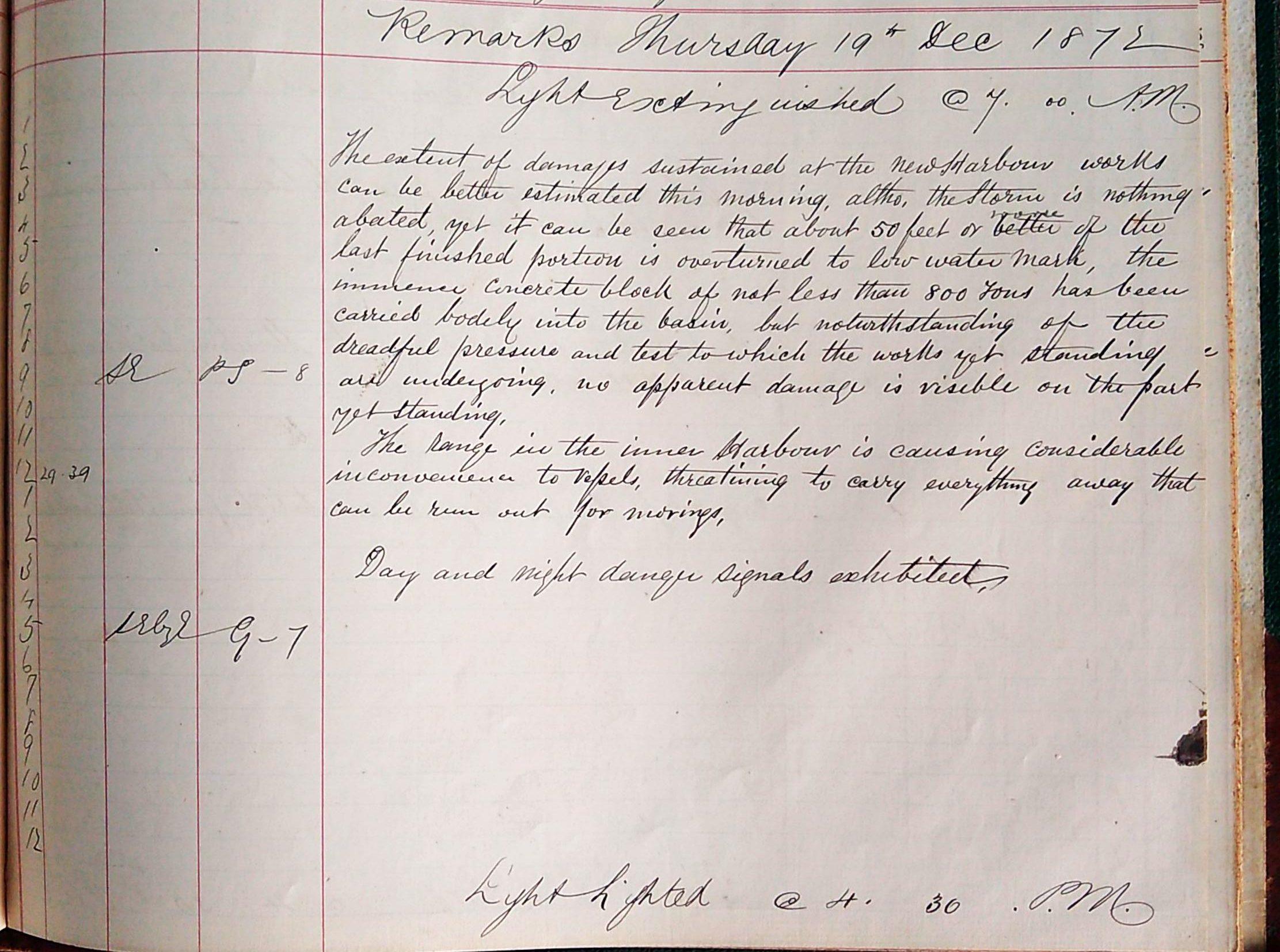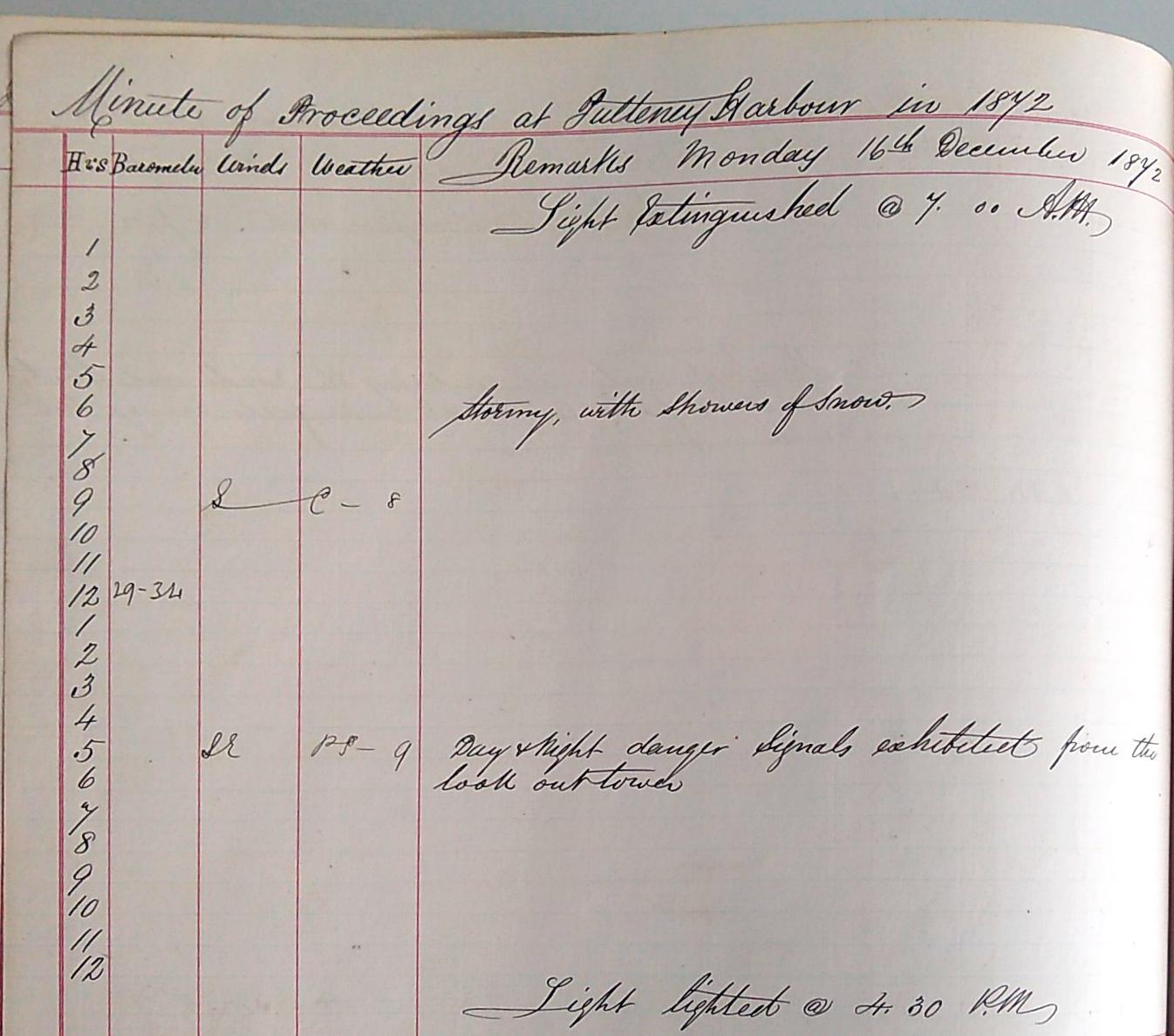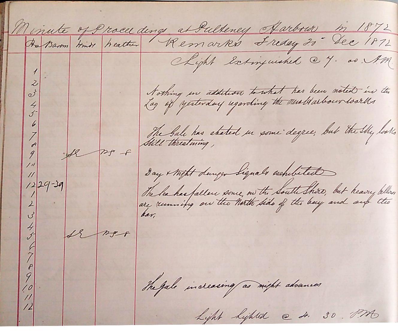 The first image below is for the 16th of December 1872. The short winter days are evident by the light not being extinguished until 0700am and then lighted again at 0430pm. The weather is ‘stormy, with showers of snow’ and ‘day & night danger signals [are] exhibited from the look out tower’. This ominous tone continues through the 17th with ‘the sea running very high in the bay, making a complete breach over the new harbour works and on the north shore’. The storm is increasing within a ‘dismal looking sky’ and the warning light continues to burn ‘day & night’.