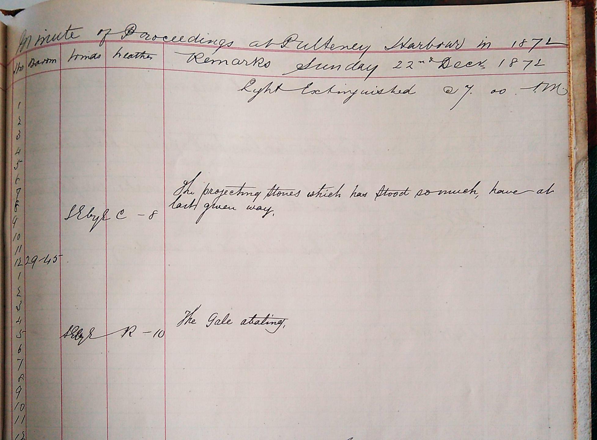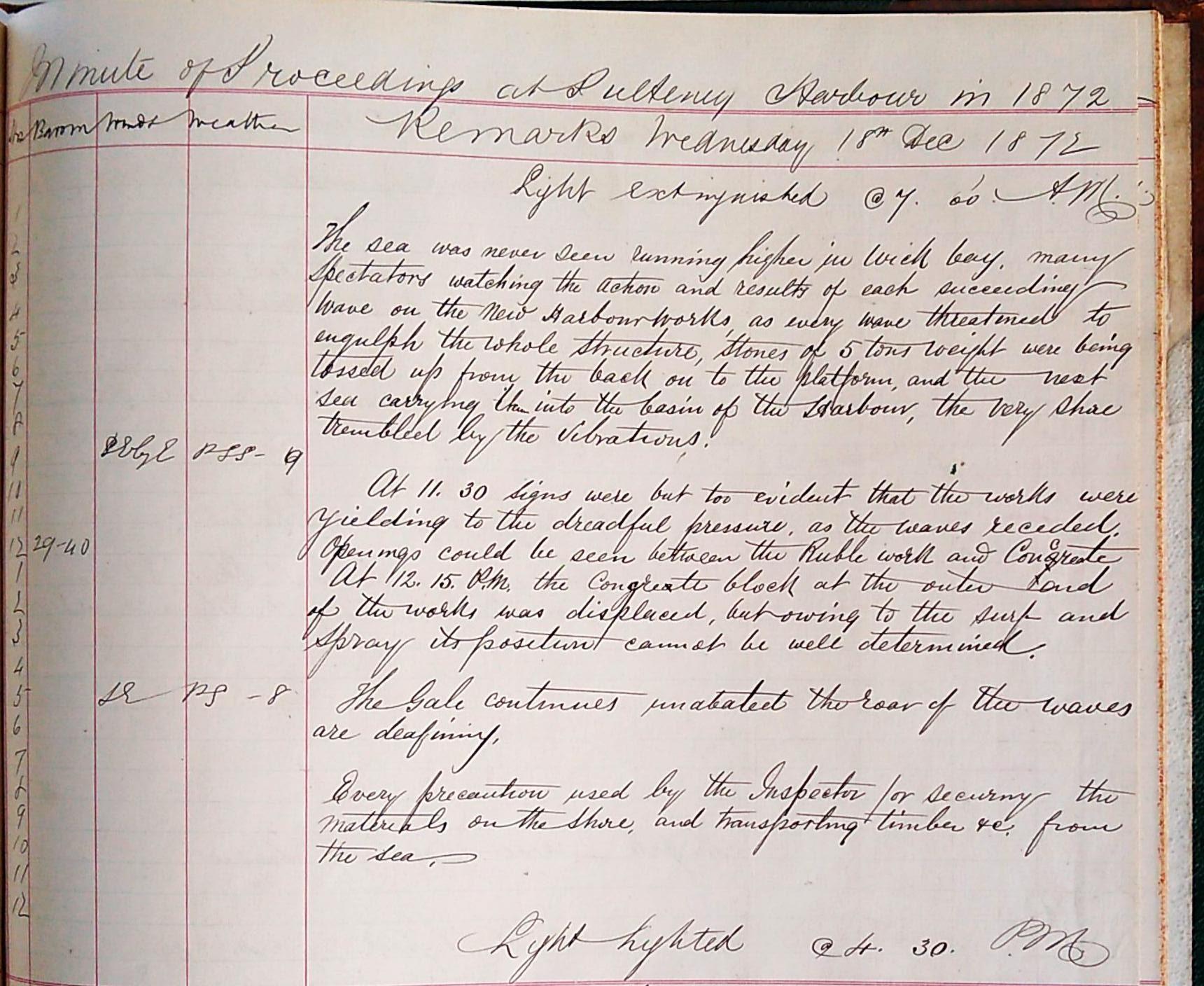 ‘The sea proved too strong for man’s arts’ [20], lamented Robert Louis Stevenson in the essay he wrote on his father. Indeed, Thomas Stevenson’s attempt to build a breakwater in Wick harbour would stand as ‘the chief disaster’[21] of his life. Speculation as to the cause of the breakwater’s multiple failures between 1861 and 1875 is still rampant today and it is not our intention here to answer this mystery. Instead, we wish to present an astonishing account of the week long storm that rocked Wick harbour in December of 1872. Again, the harbour master log books step beyond their professional purview to bless us with a harrowingly embellished account of the calamity.