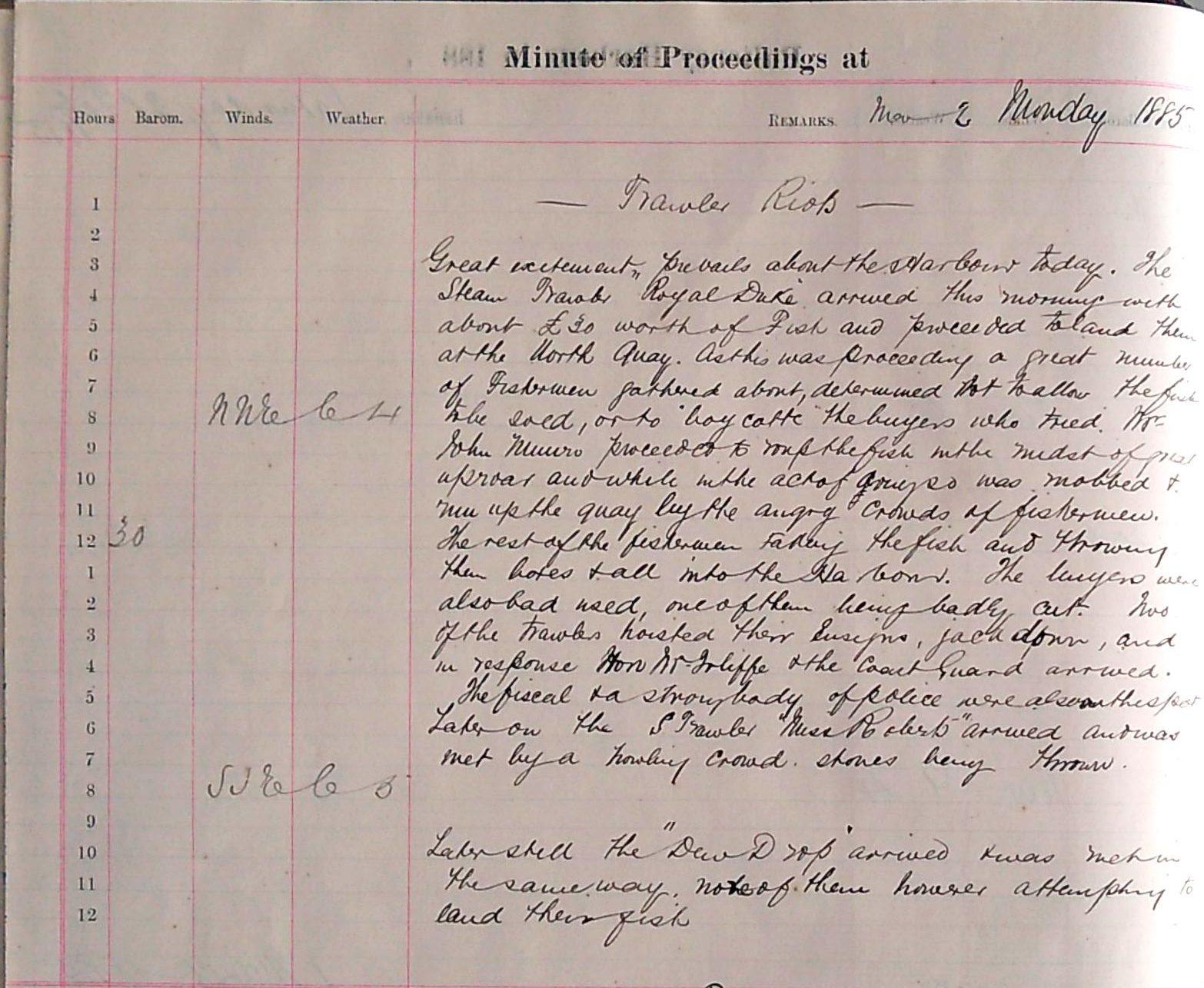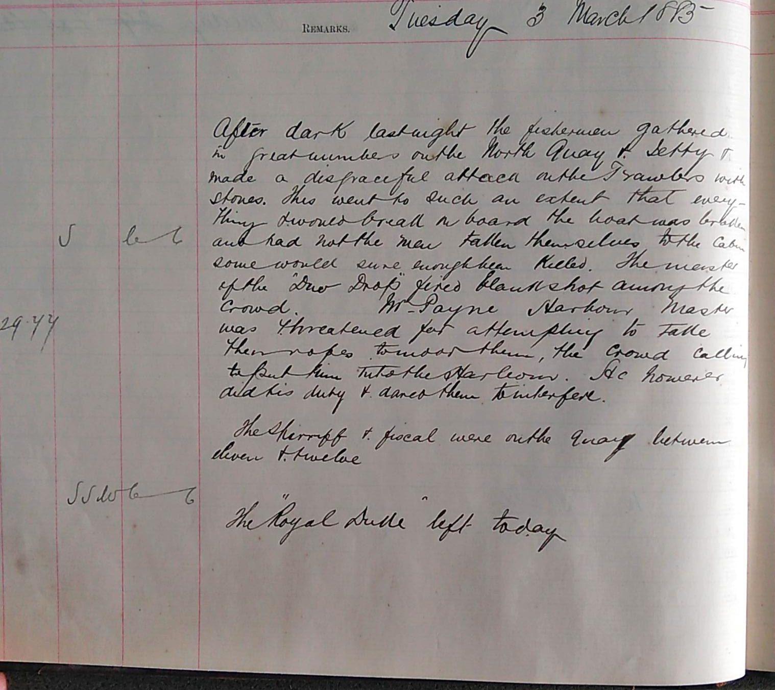 After night had fallen on the 2nd the rioting continued. The entry for the 3rd explains that ‘after dark last night the fisherman… made a disgraceful attack on the Trawlers with stones’. Again, the political bent of the harbour master’s office is clear, with apparently little sympathy for the plight of the local fishermen. Nevertheless, we are then told that the attacks ‘went to such an extent that everything… on board the boat was broken and had the men not fallen themselves to the cabin some would sure enough have been killed’. Furthermore, ‘Mr Payne [the] harbour master was threatened’ whilst taking ropes to the trawlers but we are told that he ‘did his duty and dared them to interfere’. A very brave and formidable depiction, however biased. Later, the sheriff and the fiscal are present on the quay from eleven till twelve at night and the steam trawler ‘Royal Duke’ understandably leaves the harbour.