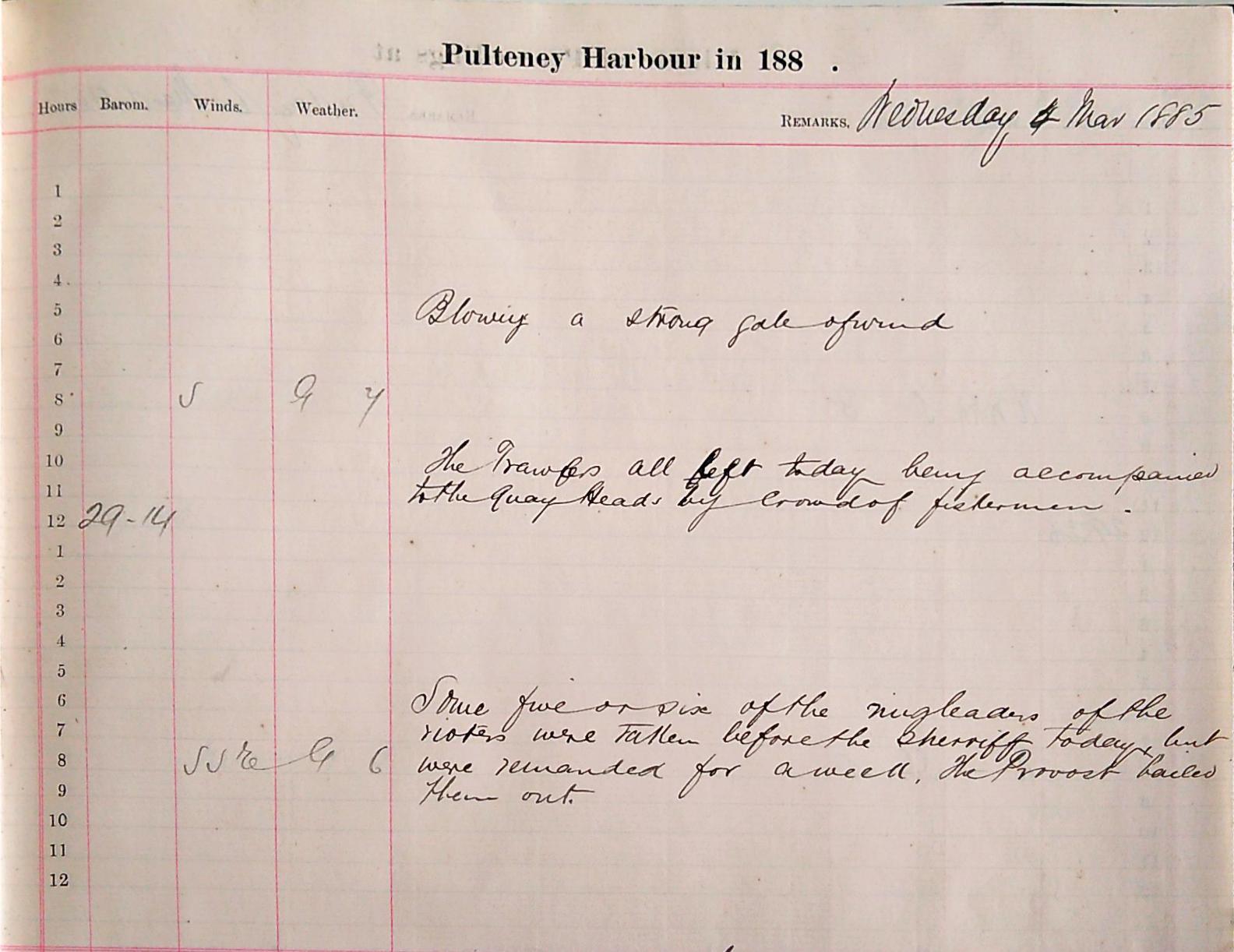 A ‘strong gale of wind’ is blowing on the 4th and all the trawlers leave the harbour ‘accompanied to the quay heads by crowds of fishermen’. Meanwhile ‘some five or six of the ringleaders of the riots were taken before the sheriff’ but were ‘remanded for a week, the Provost bailed them out’. On the 12th of March the John O’Groat Journal reported on ‘The Recent Attack on Trawlers at Wick’ saying that ‘before too hastily condemning’ the fishermen, that ‘the cause of all this outburst must be taken into consideration’. It seems even the local papers were on the side of the fishermen, some of whom received ’30 days in prison for their pains’[27].