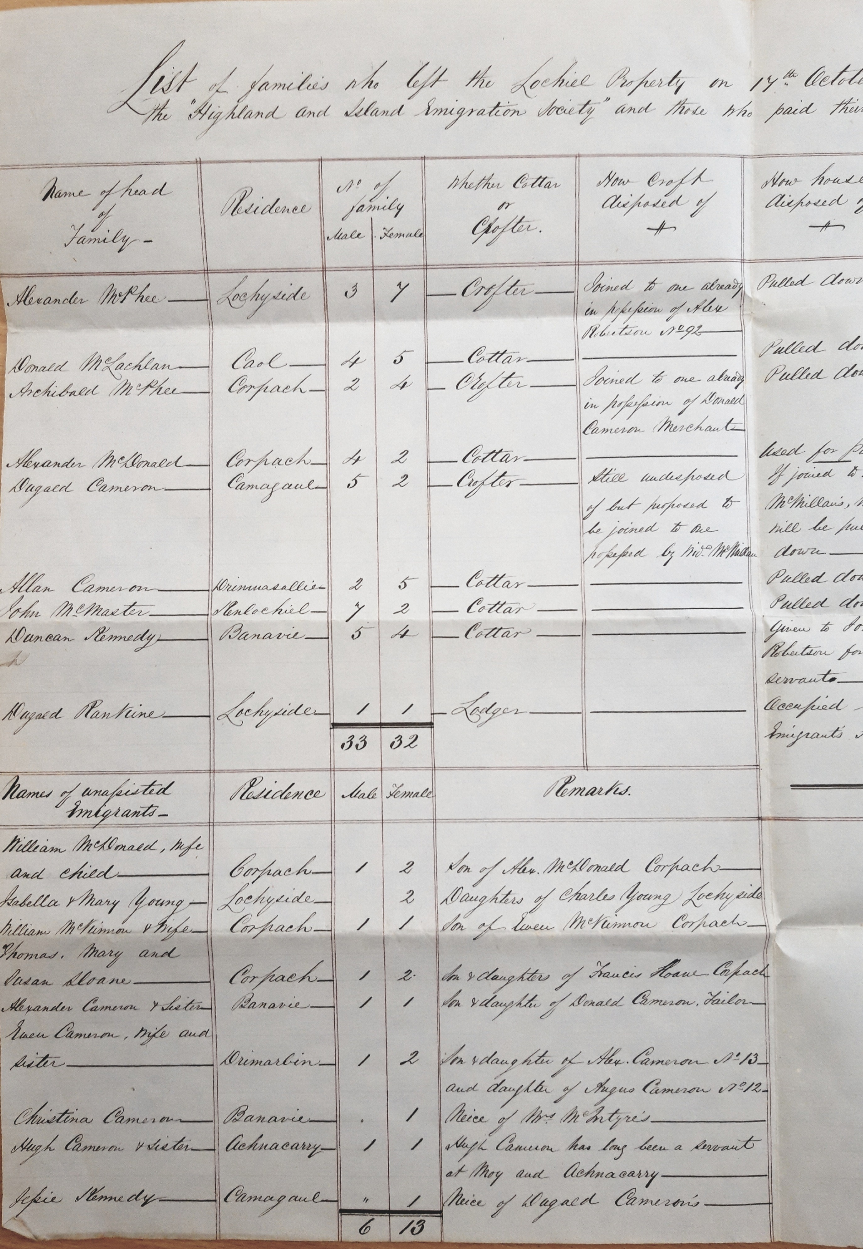 The items discussed so far are taken from our Cameron of Lochiel Collection, as is a third; a list of all families leaving the Lochiel estate on the 17th October 1853 for Australia. These emigrations were paid for by landowners, and overseen by the Highlands and Islands Emigration Society, a charity established to assist those affected by the famine in finding a more prosperous existence elsewhere. Only the head of household is named on the document, but an estimated eighty individuals left the Lochiel estate at this time.