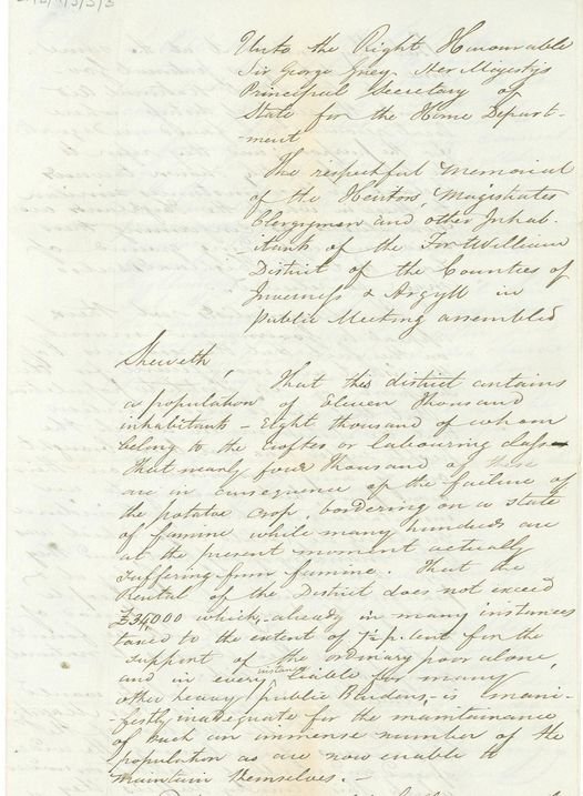 I then found another letter, dated 1851, and signed by the heritors, magistrates, and clergymen of Fort William District, appealing directly to Sir George Grey, then the Home Secretary. It is put to Sir Grey that the £34000 rental of the District, taxed to over seven percent in support of ‘the ordinary poor alone’ is ‘manifestly inadequate’ in a famine situation, where an ‘immense number of the population as are now unable to maintain themselves.’ District of Fort William is said to have eleven thousand inhabitants, some eight thousand of these belong to the ‘crofter or labouring class’, of whom four thousand are either suffering from famine or something bordering it.