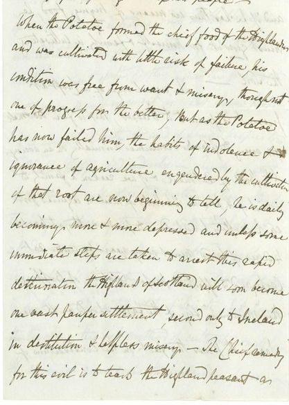 Roberts’ letter is interesting. It at once reveals sympathy towards the Highlander’s situation, and an alertness to the fact that things could soon become immeasurably worse without intervention from the landowning class. However, Roberts was clearly of the belief, one shared by many landowners and agriculturalists of the time, that the Highlander’s reliance on the potato was partly the result of their own idleness.