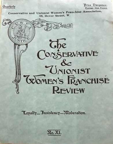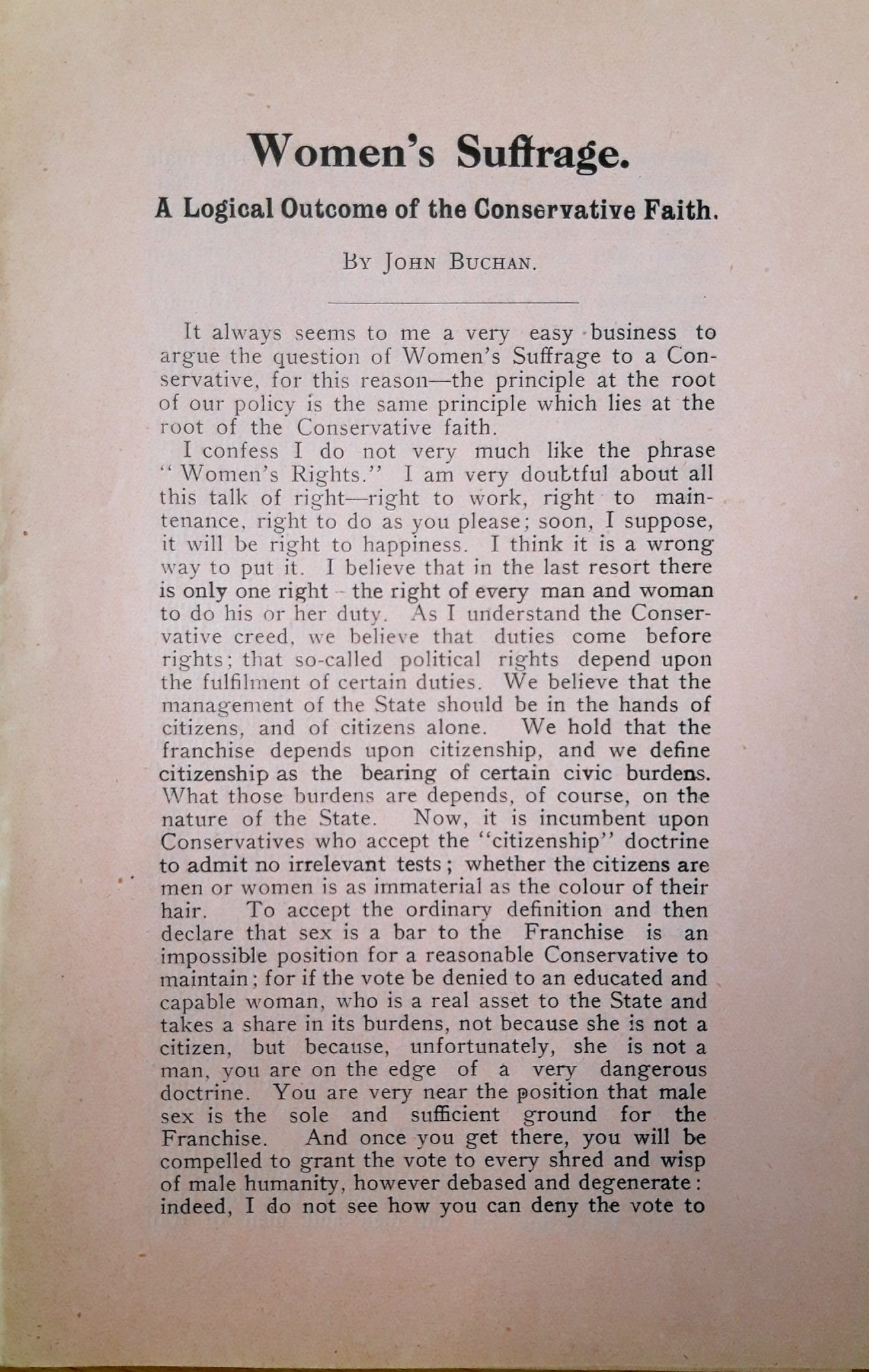 A faded pink pamphlet, written by Buchan, is entitled ‘Women’s Suffrage: A Logical Outcome of the Conservative Faith.’ In response to the common ‘Conservative objection’ that women’s suffrage would make ‘public life more effeminate’, Buchan asks, ‘Are our politics today so very manly? Do we rely solely or mainly on sober reason? Do we never exhibit hysteria or vapid emotion?’