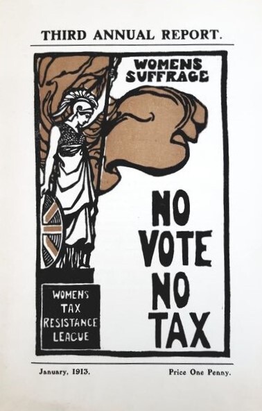 From this brief but seemingly busy time, there survives a great many pamphlets and publications, printed on brightly coloured paper and bearing such titles as, ‘Man, Woman, and The Machine’ and ‘Women’s Suffrage and the Social Evil’. The language is ardent, much of it fired in an internal battle-happening within the Conservative Party, this being the party upholding more traditional values. One conservative voice making the case for the enfranchisement of women is Scot John Buchan, Unionist politician and author of The Thirty-Nine Steps amongst other works. The pamphlet below is from The Women's Tax Resistance League whose members felt the injustice of paying tax on their income, homes and servants when they lacked a parliamentary vote.