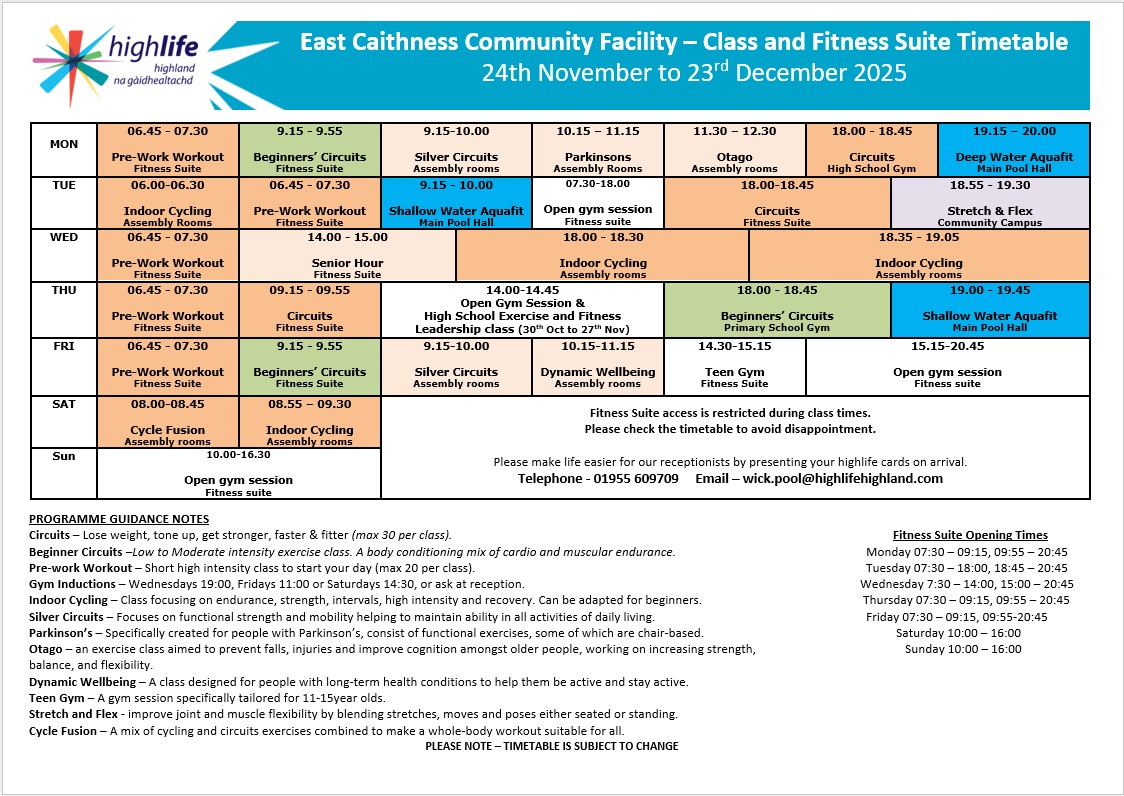 ECCF Pool Timetable 24th November to 23rd December 2025
