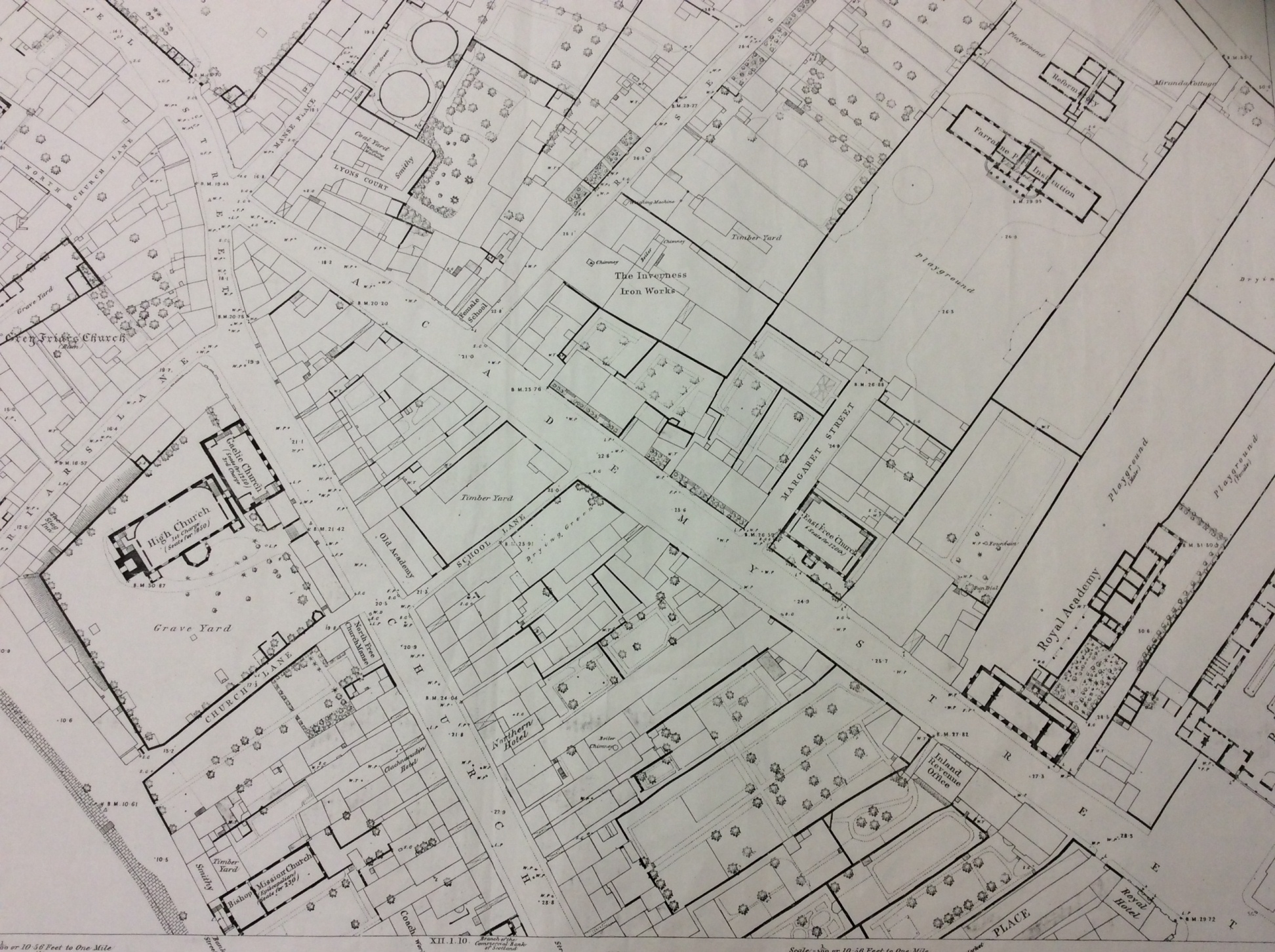 This map shows part of Inverness as it was when the first Ordnance Survey was taken. This particular sheet focuses on Academy Street and Church Street and shows Farraline Park school (now Inverness Library), the old Academy (Dunbar’s Hospital) and several churches which still exist.
