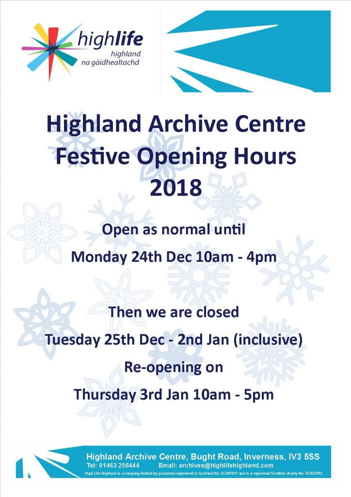 The above is the programme of events coming up at the Highland Archive Centre from April – June 2018. On Monday April 23rd, High Life Highland and UHI are co-hosting a free study day in collaboration with the First World War Centenary Partnership, led by Imperial War Museums, Gateways to the First World War, Living… Read more »Read more