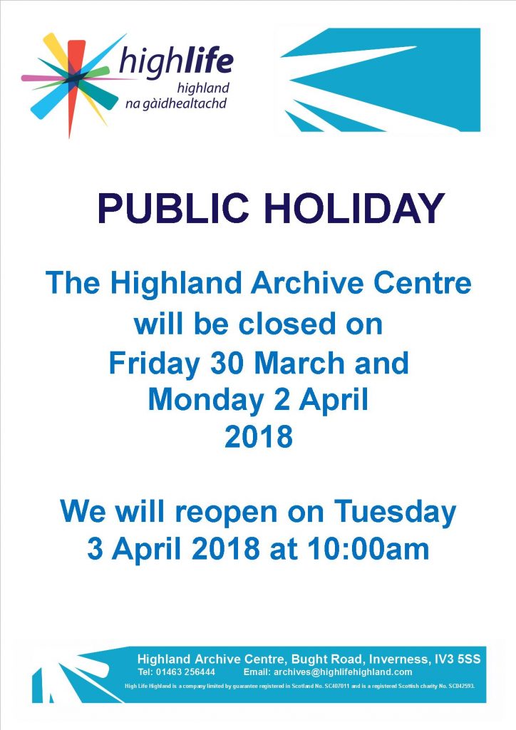 The Highland Archive Centre will be closed on Friday 30th March and Monday 2nd April. We will re-open on Tuesday 3rd April at 10amRead more