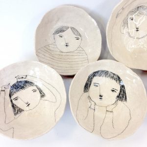 Rebecca Brown’s charmingly quirky ceramics are largely inspired by superstitions and old wives’ tales. Each ceramic piece is made using coils, slabs or pinching and mashing bits of clay together and tends to have a bit of a wobble or to lurch to one side. She says, ‘As my technical skills have grown over the last few years I find myself trying hard not to lose the wobbly-ness. Working with imagery conjured by these strange stories and sayings, I combine drawing, painting and printmaking to build narrative on the surface of hand-built ceramic, exposing brush-strokes, fingerprints and making marks to accentuate the relationship between vessel and narrative.’