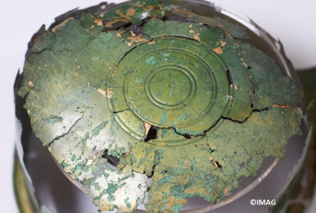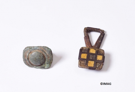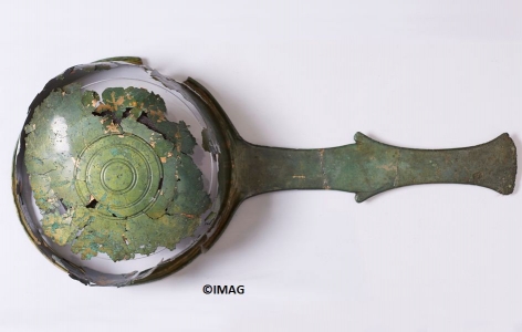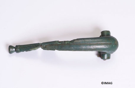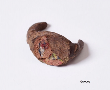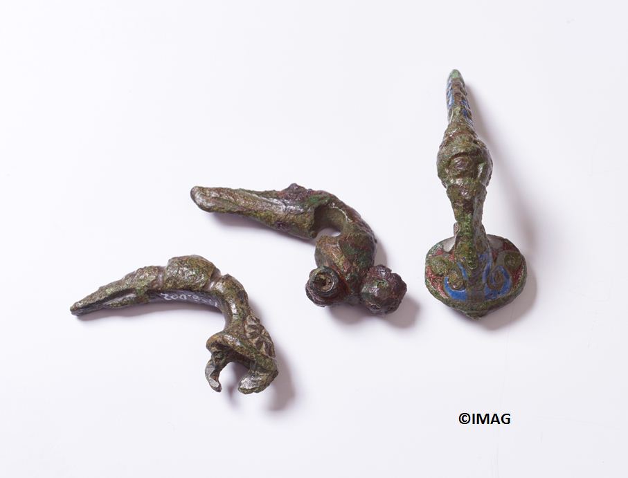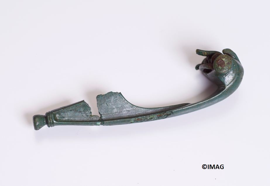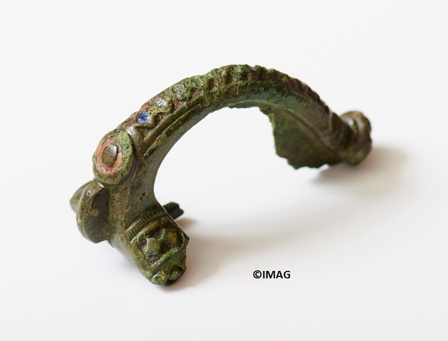 Similarly, the Raigmore Headstud Brooch (INVMG.1985.067), a Romano British personal decoration, fashioned from enamelled bronze, acts as an artistic and cultural bridge to the international language of status display and ideological activity in the Roman Iron Age. Created as a local response to personal art from Rome, it suggests a regional culture standing confident in the face of the Empire; choosing which elements of craft and display to adopt and which to adapt in order to express a more individual identity. Its recovery from within a Bronze Age funerary cairn, suggests that it was deliberately disposed, perhaps as part of a rite, now lost, giving some insight into the ideological significance of personal art objects in the given period. The aforementioned Wine Dipper and Dolphin-type Brooch also appear to have been ritually deposited.