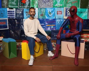 Hetain Patel portrait (seated with Spiderman). Artangel, Hetain Patel, Come As You Really Are, photograph © Lia Toby